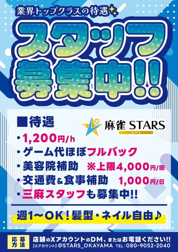 麻雀STARS 岡山店岡山県 マージャンスターズオカヤマテン 岡山県 岡山駅 徒歩1分 四麻、三麻、セット、フリー 電話する080-9052-2040 地図 店舗トップ ルール 写真/動画 イベント 求人 クーポン プロ イチオシ ランキング クチコミ 写真一覧 動画一覧 お店のコトを友達に教える Facebook X(旧Twitter) Line Mail お店を評価する 閉店・休業・移転・情報違い報告 クチコミ投稿 報告内容詳細※必須 閉店 休業 移転 情報違い 送信する