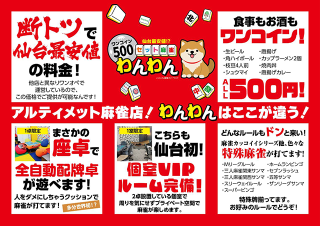 500円ワンコインセット麻雀わんわん宮城県 ゴヒャクエンワンコインセットマージャンワンワン 宮城県 青葉通一番町駅 徒歩1分 セット 電話する022-204-9238 地図 店舗トップ ルール 写真/動画 イベント 求人 クーポン プロ イチオシ ランキング クチコミ 写真一覧 動画一覧 お店のコトを友達に教える Facebook X(旧Twitter) Line Mail お店を評価する 閉店・休業・移転・情報違い報告 クチコミ投稿 報告内容詳細※必須 閉店 休業 移転 情報違い 送信する