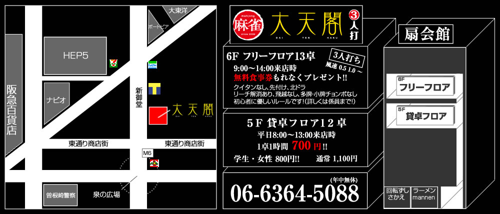 大天閣大阪府 ダイテンカク 大阪府 梅田駅 徒歩5分 フリー、セット、三麻 電話する06-6364-5088 地図 店舗トップ ルール 写真/動画 イベント 求人 クーポン プロ イチオシ ランキング クチコミ 写真一覧 動画一覧 お店のコトを友達に教える Facebook X(旧Twitter) Line Mail お店を評価する 閉店・休業・移転・情報違い報告 クチコミ投稿 報告内容詳細※必須 閉店 休業 移転 情報違い 送信する