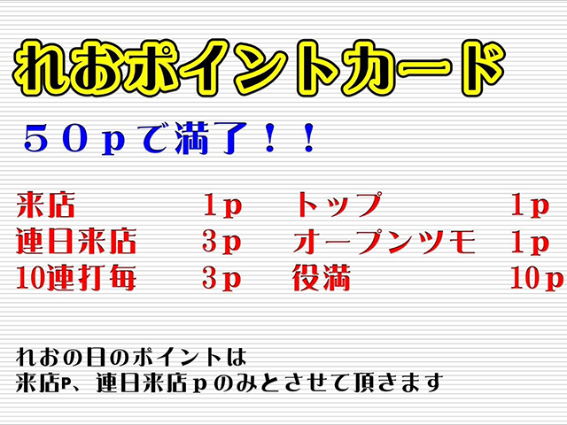 麻雀れお東京都 マージャンレオ 東京都 新宿駅 徒歩5分 四麻、セット、フリー 電話する03-3205-4705 地図 店舗トップ ルール 写真/動画 イベント 求人 クーポン プロ イチオシ ランキング クチコミ イチオシ詳細 スポットライトイチオシ イチオシ 1 毎月10日・20日・30日はれお感謝DAY✨ 毎月10日・20日・30日はれお感謝DAY✨ フリーのお客様は、なんと!ゲーム代半額でご遊戯いただけます♪ AM10時より開催しておりますので、皆様のご来店をお待ちしております(*´ω`*) イチオシ 2 3勝戦W 平日10時~開催!!! 平日は、毎日10時~3勝戦を開催中!!! ぜひ、チャレンジしてください(^^)/ イチオシ 3 お得なポイントカード♪ 50Pで満了!! ※詳細は添付画像をご確認くださいm(_ _)m お店のコトを友達に教える Facebook X(旧Twitter) Line Mail お店を評価する 閉店・休業・移転・情報違い報告 クチコミ投稿 報告内容詳細※必須 閉店 休業 移転 情報違い 送信する