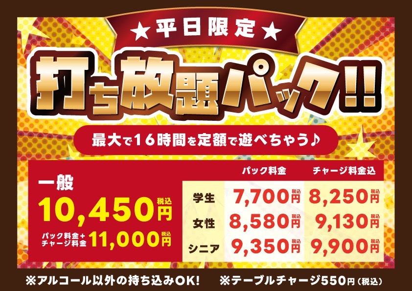 特に自信を持ってお薦めさせて頂く平日限定打ち放題パックは最大16時間打ち放題で下記料金!