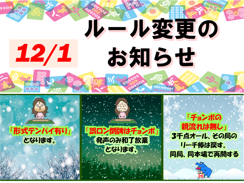 麻雀 JAM(ジャム) 中野店東京都 マージャン ジャム ナカノテン 東京都 中野駅 北口 徒歩1分 フリー、セット 電話する03-3387-5506 地図 店舗トップ ルール 写真/動画 イベント 求人 クーポン プロ イチオシ ランキング クチコミ イチオシ詳細 スポットライトイチオシ イチオシ 1 12/1 ルール3点変更のお知らせ お客様に寄り添ったルールへ! 〇「形式テンパイあり」 〇「チョンボの親流れ無し」 3千点オール、その局のリーチ棒は戻す 同局同本場で再開 〇「誤ロン倒牌はチョンボ」 発声のみは和了放棄 お店のコトを友達に教える Facebook X(旧Twitter) Line Mail お店を評価する 閉店・休業・移転・情報違い報告 クチコミ投稿 報告内容詳細※必須 閉店 休業 移転 情報違い 送信する