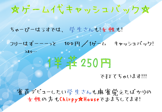 まーじゃん Chirpy House宮城県 マージャン チャーピーハウス 宮城県 仙台駅 徒歩6分 四麻、フリー、セット、三麻 電話する022-797-5998 地図 店舗トップ ルール 写真/動画 イベント 求人 クーポン プロ イチオシ ランキング クチコミ イチオシ詳細 イチオシ 1 ご新規さま限定キャンペーン ちゃーぴーはうすでフリーデビューされたお客様全員に、今日から使えるゲーム代バックのサービス券をプレゼント! 1日目は1ゲーム、、 5日目は5ゲーム分のゲーム代をキャッシュバック! ぜひフリーデビューはちゃーぴーはうすで ((*’∇’*)ヨロ((*・v・)シク( _ _)デス♪ イチオシ 2 学生女性ゲーム代キャッシュバック ちゃーぴーはうすでは、 学生さんも! 女性も!! フリーはずーーーっと100円割引! つまり… 250円で1半荘打てちゃいます! 麻雀覚えたけど実際に牌触ってみたい! フリーで麻雀打ってみたい! って方はぜひちゃーぴーはうすでフリーデビューお待ちしてます! お店のコトを友達に教える Facebook X(旧Twitter) Line Mail お店を評価する 閉店・休業・移転・情報違い報告 クチコミ投稿 報告内容詳細※必須 閉店 休業 移転 情報違い 送信する