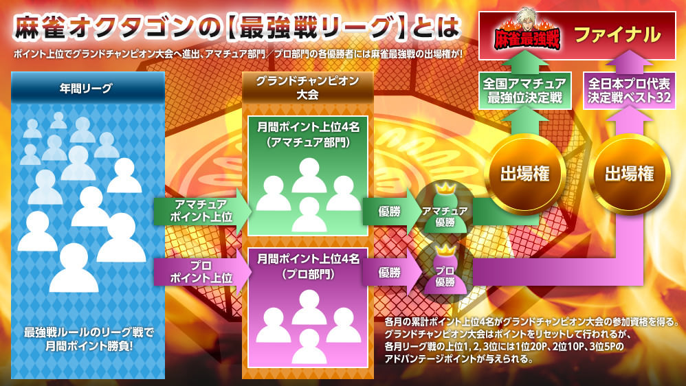 グランドチャンピオン大会はポイントをリセットして行われるが、各月リーグ戦のプロ部門上位1,2,3位には1位20P、2位10P、3位5P。アマチュア部門は1位10P、2位5P 、3位3P、4位2P、5位1Pのアドバンテージポイントが与えられる。