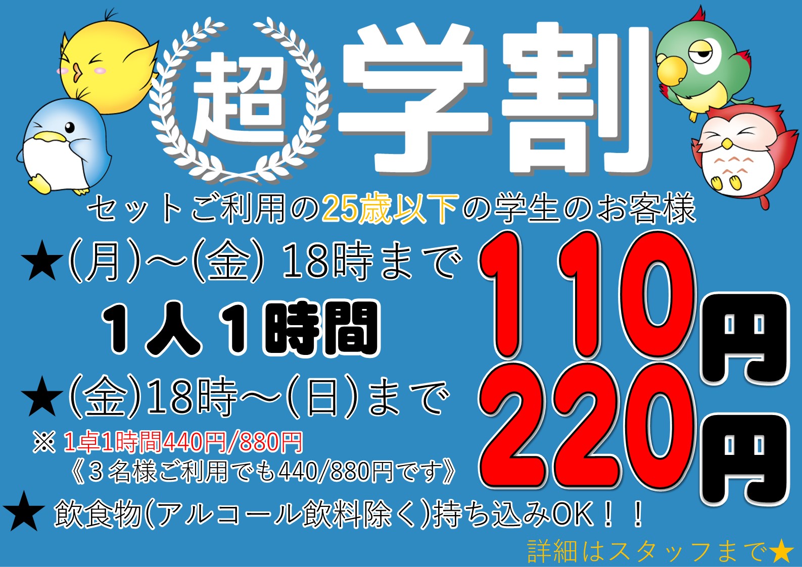 学生のセット様は平日(月曜日から金曜日の18:00まで)おひとり1時間110円でご遊戯できます。