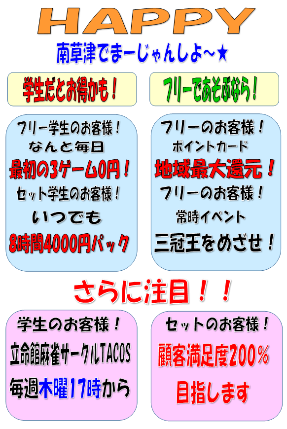 HAPPY滋賀県 ハッピー 滋賀県 南草津駅 徒歩20分 三麻、四麻、セット、フリー 電話する077-562-7700 地図 店舗トップ ルール 写真/動画 イベント 求人 クーポン プロ イチオシ ランキング クチコミ 総合 HAPPY - 5 0 ? 点数について 0件 詳細 雀荘クチコミの点数概要 クチコミの点数は、総合点数を中心に、全部で11項目あります。 12項目は「雀荘の営業形態についての項目」と「その他の環境についての項目」の2つにわかれます。 総合スコア (計11項目) 営業形態点数 (6項目) 雀荘の営業形態についての点数 フリー セット 健康麻雀 麻雀教室 ノーレート 三麻 その他の環境点数 (5項目) 雀荘の設備、その他の環境についての点数 設備 接客 居心地 CP(コストパフォーマンス)・清潔感 ※麻雀王国雀荘検索のクチコミの点数は、当社独自の基準に基づく評価であり、雀荘の価値を何ら保証するものではあ りません。あくまでの一つの参考としてご活用ください。 雀荘クチコミ点数の算出方法要 クチコミの点数は、「ユーザー評価」に独自のアルゴリズムで掛け合わせて算出しております。 麻雀王国では、日々信頼性の高い点数を追及し、微調整を行っております。 ユーザー評価 個人が付けた点数 (雰囲気、感性、感覚、状況、主観など) フリー- セット- 健康麻雀- 麻雀教室- ノーレート- 三麻- 設備 - | 接客 - | 居心地 - | CP(コストパフォーマンス) - | 清潔感 - フリー ¥300/般 セット ¥1,200/般 ¥600/学 長期契約安心店舗 全国* 滋賀県1位 オリジナルのオレンジ8筒採用! そのほかにも、毎月の成績ランキングなど、イベント盛りだくさんです! 学生セットなんと1卓1時間600円!8時間パック4,000円! お得な料金と楽しい雰囲気で、皆様のお越しをお待ちしております♪ 学生の方や初心者の方にも優しい、アットホームなお店です! 是非一度ご来店ください(*'▽') >>>学生限定!貸卓セット料金8時間1卓4000円!<<< 続きを見る 閉じる お店のイチオシポイント イチオシ 1 仲良く和気あいあい、アットホームなお店です 学生の方からご年配の方まで、幅広い層の方に麻雀を楽しんでいただけます! 初めてのフリーでも大歓迎!是非一度ご来店ください♪ イチオシ 2 ポイントカードは地域最大、キャッシュバックあります! お客様に長く楽しく通い続けていただけるよう、お得なポイントカードシステムを導入しております イチオシ 3 毎月イベント開催、豪華特典プレゼント! 毎月イベント開催中! 当店での麻雀がさらに楽しくなること請け合いです! お店のコトを友達に教える Facebook X(旧Twitter) Line Mail お店を評価する 閉店・休業・移転・情報違い報告 クチコミ投稿 報告内容詳細※必須 閉店 休業 移転 情報違い 送信する 最新情報 2024年2月29日(木) イベント 毎月開催!成績ランキング♪ トップ率・平均順位・防御率(ラス率)の成績上位者各3名に豪華景品プレゼント! 「ネット予約」&「チェックイン」で 来店人数×100Gもらえる! ログイン ご予約情報入力 来店日※ 2013年12月31日(火) 卓数※ 12345678910卓 予定開始※ 1:00 2:00 3:00 4:00 5:00 6:00 7:00 8:00 9:00 10:00 11:00 12:00 13:00 14:00 15:00 16:00 17:00 18:00 19:00 20:00 21:00 22:00 23:00 24:00 予定終了※ 1:00 2:00 3:00 4:00 5:00 6:00 7:00 8:00 9:00 10:00 11:00 12:00 13:00 14:00 15:00 16:00 17:00 18:00 19:00 20:00 21:00 22:00 23:00 24:00 お名前※ 携帯TEL※ メール※ ルール※ 四麻 三麻 点数※ 25000点 30000点 赤枚数※ 赤5マン01234 赤5ピン01234 赤5ソー01234 その他 チップ 焼鳥 備考 予約する クチコミ 投稿する お店の情報詳細 店名 HAPPY 住所 〒525-0072 [地図] 滋賀県草津市笠山4丁目3-20 電話 077-562-7700 交通手段 琵琶湖線 南草津駅 徒歩20分 JR南草津駅より徒歩20分 営業時間 15:00~ラスト [平日] 12:00~ラスト [土日祝] 定休日 木 〈木曜日〉 フリーのみお休みをいただきます。 営業内容 三麻、四麻、セット、フリー ゲーム代(フリー) ¥300/般 [東南戦/1回] ゲーム代(セット) ¥1,200/般 ¥600/学 [1卓1時間あたり] ゲーム代(健康麻雀) ゲーム代(麻雀教室) その他の料金 学生限定!貸卓セット料金 8時間1卓4000円! オープン日 2014年3月26日 お店のサービス・システム・設備 総卓数 7卓 卓種 点数表示付全自動卓×4全自動配牌卓×3 サービス パック料金、学割、自動配牌卓、フリードリンク システム・設備 ネット環境、PC、タブレット、スマホ 備考 関連エリア・路線 滋賀県の雀荘ランキング 南草津駅の雀荘ランキング 滋賀県の雀荘特集 滋賀県草津市の雀荘特集 南草津駅の雀荘特集 お店を利用する 電話する077-562-7700 地図滋賀県草津市笠山4丁目3-20 店舗トップ ルール 写真/動画 イベント 求人 クーポン プロ イチオシ ランキング ソーシャル [ 管理者ページ ]