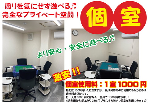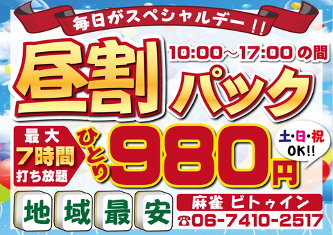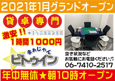 麻雀サロン ビトゥイン【セット専門店】大阪府 マージャンサロン ビトゥイン 大阪府 本町駅 徒歩5分 セット 電話する06-7410-2517 地図 店舗トップ ルール 写真/動画 イベント 求人 クーポン プロ イチオシ ランキング クチコミ 総合 麻雀サロン ビトゥイン【セット専門店】 - 5 0 ? 点数について 0件 詳細 雀荘クチコミの点数概要 クチコミの点数は、総合点数を中心に、全部で11項目あります。 12項目は「雀荘の営業形態についての項目」と「その他の環境についての項目」の2つにわかれます。 総合スコア (計11項目) 営業形態点数 (6項目) 雀荘の営業形態についての点数 フリー セット 健康麻雀 麻雀教室 ノーレート 三麻 その他の環境点数 (5項目) 雀荘の設備、その他の環境についての点数 設備 接客 居心地 CP(コストパフォーマンス)・清潔感 ※麻雀王国雀荘検索のクチコミの点数は、当社独自の基準に基づく評価であり、雀荘の価値を何ら保証するものではあ りません。あくまでの一つの参考としてご活用ください。 雀荘クチコミ点数の算出方法要 クチコミの点数は、「ユーザー評価」に独自のアルゴリズムで掛け合わせて算出しております。 麻雀王国では、日々信頼性の高い点数を追及し、微調整を行っております。 ユーザー評価 個人が付けた点数 (雰囲気、感性、感覚、状況、主観など) フリー- セット- 健康麻雀- 麻雀教室- ノーレート- 三麻- 設備 - | 接客 - | 居心地 - | CP(コストパフォーマンス) - | 清潔感 - セット ¥1,000/般 全国45位 大阪府1位 【2021年1月グランドオープン!】 大阪の真ん中に、<個室が1卓1時間1,000円>で利用できるセット専門店がオープンです! 新規オープンのきれいな店内、持ち込みOK、禁煙ルームもありで至れり尽くせり♪お仲間と周りを気にせずわいわい麻雀出来ちゃいます! 更に今なら「昼割」実施中!4名なら4時間、3名なら3時間分のご料金で最大7時間利用可能です(`・ω・´)b ご予約はお電話で! ☎06-7410-2517 お待ちしております! オープン記念! 「麻雀王国を見た」でソフトドリンクおひとり様1杯プレゼント! 詳しくは「クーポン」のタブをクリック♪ 続きを見る 閉じる お店のイチオシポイント イチオシ 1 地域最安!1卓1時間1,000円で【個室】が使える格安料金( ゚Д゚) いいんですか!?こんな料金で!? …いいんです。 お客様に楽しんでいただいて、何度でも通っていただけるよう、ビトゥイン、頑張ります! イチオシ 2 持ち込みOK!わいわい楽しく麻雀しましょう! ソフトドリンクはもちろん、アルコールやお食事も持ち込みOKです! 好きなお酒や食べ物を持ち込んで、みんなで麻雀なんていかがでしょう? ※お持ち込みは常識の範囲内でお願いします☆ イチオシ 3 禁煙ルーム有で、煙が苦手な方も安心♪ タバコを吸わないお客様には、禁煙ルームを完備しております! 煙の臭いを気にせず麻雀を楽しめる! ご希望の方は、ご予約の際に「禁煙ルーム希望」とお伝えください。 お店のコトを友達に教える Facebook X(旧Twitter) Line Mail お店を評価する 閉店・休業・移転・情報違い報告 クチコミ投稿 報告内容詳細※必須 閉店 休業 移転 情報違い 送信する 「ネット予約」&「チェックイン」で 来店人数×100Gもらえる! ログイン ご予約情報入力 来店日※ 2013年12月31日(火) 卓数※ 12345678910卓 予定開始※ 1:00 2:00 3:00 4:00 5:00 6:00 7:00 8:00 9:00 10:00 11:00 12:00 13:00 14:00 15:00 16:00 17:00 18:00 19:00 20:00 21:00 22:00 23:00 24:00 予定終了※ 1:00 2:00 3:00 4:00 5:00 6:00 7:00 8:00 9:00 10:00 11:00 12:00 13:00 14:00 15:00 16:00 17:00 18:00 19:00 20:00 21:00 22:00 23:00 24:00 お名前※ 携帯TEL※ メール※ ルール※ 四麻 三麻 点数※ 25000点 30000点 赤枚数※ 赤5マン01234 赤5ピン01234 赤5ソー01234 その他 チップ 焼鳥 備考 予約する クチコミ 投稿する お店の情報詳細 店名 麻雀サロン ビトゥイン【セット専門店】 住所 〒541-0048 [地図] 大阪府大阪市中央区瓦町4丁目5-3 日宝西本町ビル2F 電話 06-7410-2517 交通手段 大阪市営地下鉄中央線 本町駅 徒歩5分 大阪市営地下鉄御堂筋線 本町駅 徒歩5分 大阪市営地下鉄四つ橋線 肥後橋駅 徒歩8分 営業時間 10:00~ラスト 定休日 営業内容 セット ゲーム代(フリー) ゲーム代(セット) ¥1,000/般 [1卓あたりの料金になります。 3人でも4人でも、1卓1時間1000円です♪] ゲーム代(健康麻雀) ゲーム代(麻雀教室) その他の料金 【昼割パック】 10:00~17:00の間、最大7時間打ち放題でお一人様<980円>! 土日祝のご利用も可能です。 オープン日 2021年1月20日 お店のサービス・システム・設備 総卓数 10卓 卓種 点数表示付全自動卓×3全自動配牌卓×7 その他 [自動配牌卓「アルティマ」を完備しております。] サービス パック料金、禁煙 システム・設備 備考 関連エリア・路線 大阪府の雀荘ランキング 本町駅の雀荘ランキング 本町駅の雀荘ランキング 肥後橋駅の雀荘ランキング 大阪府の雀荘特集 大阪府大阪市中央区の雀荘特集 本町駅の雀荘特集 本町駅の雀荘特集 肥後橋駅の雀荘特集 お店を利用する 電話する06-7410-2517 地図大阪府大阪市中央区瓦町4丁目5-3日宝西本町ビル2F 店舗トップ ルール 