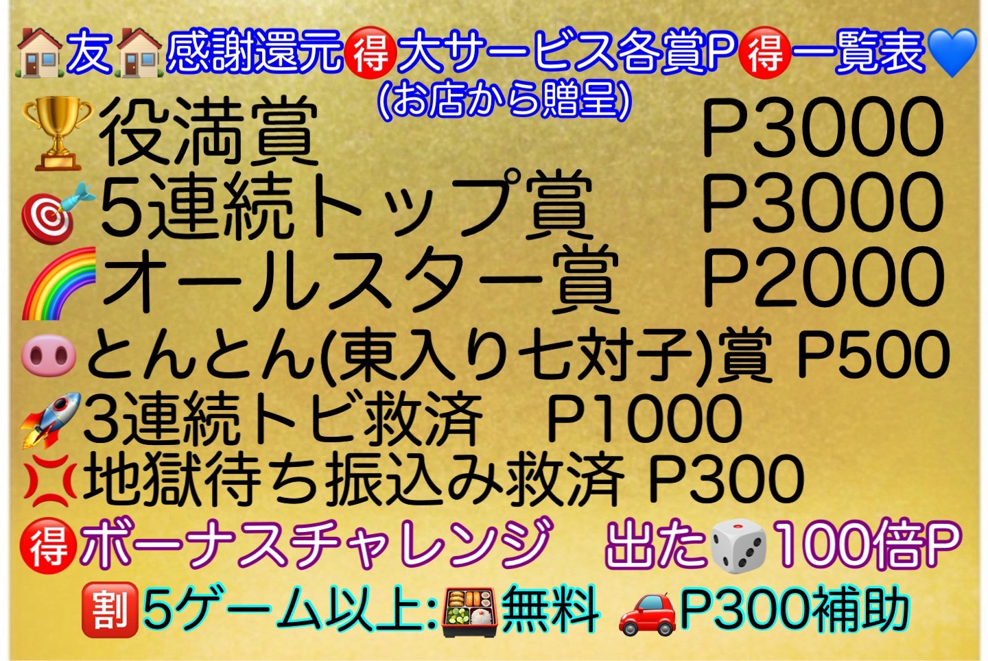 麻雀 友千葉県 マージャン トモ 千葉県 八千代台駅 徒歩2分 四麻、三麻、セット、フリー 電話する047-484-7117 地図 店舗トップ ルール 写真/動画 イベント 求人 クーポン プロ イチオシ ランキング クチコミ 総合 麻雀 友 3.0 5 8 ? 点数について 8件 詳細 雀荘クチコミの点数概要 クチコミの点数は、総合点数を中心に、全部で11項目あります。 12項目は「雀荘の営業形態についての項目」と「その他の環境についての項目」の2つにわかれます。 総合スコア (計11項目) 営業形態点数 (6項目) 雀荘の営業形態についての点数 フリー セット 健康麻雀 麻雀教室 ノーレート 三麻 その他の環境点数 (5項目) 雀荘の設備、その他の環境についての点数 設備 接客 居心地 CP(コストパフォーマンス)・清潔感 ※麻雀王国雀荘検索のクチコミの点数は、当社独自の基準に基づく評価であり、雀荘の価値を何ら保証するものではあ りません。あくまでの一つの参考としてご活用ください。 雀荘クチコミ点数の算出方法要 クチコミの点数は、「ユーザー評価」に独自のアルゴリズムで掛け合わせて算出しております。 麻雀王国では、日々信頼性の高い点数を追及し、微調整を行っております。 ユーザー評価 個人が付けた点数 (雰囲気、感性、感覚、状況、主観など) フリー3.0 セット3.0 健康麻雀- 麻雀教室- ノーレート- 三麻- 設備 3.0 | 接客 3.0 | 居心地 3.0 | CP(コストパフォーマンス) 3.0 | 清潔感 3.0 フリー ¥600/般 セット ¥300/般 長期契約安心店舗 全国* 千葉県* ✨10月1日新キャンペーン夕暮れサービスキャンペーン開始いたします。✨ 上記写真ご確認ください。 詳細はぜひ店舗にご遠慮なくなんでもお問い合わせください。 047‐486‐7881 又は 090‐7700‐1161 千葉県八千代台駅の改札を出て、徒歩3分にあります。 とっても明るくアットホームなお店です。 老若男女問わずまたお一人様でも気軽に楽しんでいただけるお店です。 無料駐車場もご用意しておりますので、車でも電車でもお気軽にご来店いただけます。 日替わりイベントや条件達成等でのポイント制度も実施中です♪詳しくは「イベント」「イチオシ」を御覧ください 続きを見る 閉じる お店のイチオシポイント イチオシ 1 1‐10‐30 イチオシ 2 無料駐車場あり 当店には無料駐車場のご用意がありますので、時間を気にせず麻雀を楽しんでいただけます♪ イチオシ 3 1Fの居酒屋「串焼きとんとん」は姉妹店!できたての美味しい出前OK! 当店1階には、姉妹店の「串焼きとんとん」があります! 串物や生ビールなど、各種出前をご注文いただけます◎ お店のコトを友達に教える Facebook X(旧Twitter) Line Mail お店を評価する 閉店・休業・移転・情報違い報告 クチコミ投稿 報告内容詳細※必須 閉店 休業 移転 情報違い 送信する 最新情報 2025年9月30日(火) イベント 🔥5連続トップ賞!!🔥 詳細はお写真又は店舗まで 「ネット予約」&「チェックイン」で 来店人数×100Gもらえる! ログイン ご予約情報入力 来店日※ 2013年12月31日(火) 卓数※ 12345678910卓 予定開始※ 1:00 2:00 3:00 4:00 5:00 6:00 7:00 8:00 9:00 10:00 11:00 12:00 13:00 14:00 15:00 16:00 17:00 18:00 19:00 20:00 21:00 22:00 23:00 24:00 予定終了※ 1:00 2:00 3:00 4:00 5:00 6:00 7:00 8:00 9:00 10:00 11:00 12:00 13:00 14:00 15:00 16:00 17:00 18:00 19:00 20:00 21:00 22:00 23:00 24:00 お名前※ 携帯TEL※ メール※ ルール※ 四麻 三麻 点数※ 25000点 30000点 赤枚数※ 赤5マン01234 赤5ピン01234 赤5ソー01234 その他 チップ 焼鳥 備考 予約する クチコミ 投稿する 麻雀 友 千葉県 八千代台駅 一年くらい前に行った時は長老の年配のお客さんが多かったけど最近は若いお客さんも多く行きやすくなった 2025/10/02 (2025/10訪問) ゲスト さんのクチコミ 総合 4.0 麻雀 友 千葉県 八千代台駅 セットで行きました。若めの店員さん?の愛想がかなり良き。フリーのお客が店員いじり過ぎ。かわいそう 2024/10/13 (2024/10訪問) ゲスト さんのクチコミ 総合 4.0 麻雀 友 千葉県 八千代台駅 久々に行ったけど雰囲気が一転 かなり感じの良い店になったと思う 2023/10/13 (2023/10訪問) ゲスト さんのクチコミ 総合 4.0 お店の情報詳細 店名 麻雀 友 住所 〒276-0034 [地図] 千葉県八千代市八千代台西1-1-30 電話 047-484-7117 交通手段 京成本線 八千代台駅 徒歩2分 八千代台駅西口に降りて線路側歩き踏切右横 営業時間 10:00~ラスト 定休日 年中無休 ※年末年始、お盆はお休みです 営業内容 四麻、三麻、セット、フリー ゲーム代(フリー) ¥600/般 [東南戦/1回] [女性割あり 1ゲーム毎にポイント還元! 詳細はお店にてご確認ください。] ¥500/般 [東南戦/1回] ゲーム代(セット) ¥300/般 [1卓1200円/1時間 6時間以上のご利用でサービスあり ※詳細はお店でご確認ください] ゲーム代(健康麻雀) ゲーム代(麻雀教室) その他の料金 オープン日 初投稿者 ゲスト お店のサービス・システム・設備 総卓数 6卓 卓種 点数表示付全自動卓×3全自動配牌卓×3 サービス 女性割、学割、駐車場、自動配牌卓、フリードリンク システム・設備 PC、タブレット、スマホ、ネット環境、大型TV、ウォシュレット、空気清浄機 備考