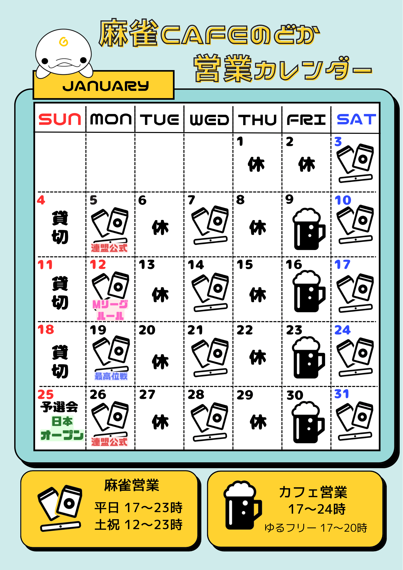 麻雀cafe のどか岩手県 マージャンカフェノドカ 岩手県 盛岡駅 徒歩15分 四麻、ノーレート、麻雀教室、セット、フリー 電話する070-8343-3567 地図 店舗トップ ルール 写真/動画 イベント 求人 クーポン プロ イチオシ ランキング クチコミ 総合 麻雀cafe のどか 3.0 5 6 ? 点数について 6件 詳細 雀荘クチコミの点数概要 クチコミの点数は、総合点数を中心に、全部で11項目あります。 12項目は「雀荘の営業形態についての項目」と「その他の環境についての項目」の2つにわかれます。 総合スコア (計11項目) 営業形態点数 (6項目) 雀荘の営業形態についての点数 フリー セット 健康麻雀 麻雀教室 ノーレート 三麻 その他の環境点数 (5項目) 雀荘の設備、その他の環境についての点数 設備 接客 居心地 CP(コストパフォーマンス)・清潔感 ※麻雀王国雀荘検索のクチコミの点数は、当社独自の基準に基づく評価であり、雀荘の価値を何ら保証するものではあ りません。あくまでの一つの参考としてご活用ください。 雀荘クチコミ点数の算出方法要 クチコミの点数は、「ユーザー評価」に独自のアルゴリズムで掛け合わせて算出しております。 麻雀王国では、日々信頼性の高い点数を追及し、微調整を行っております。 ユーザー評価 個人が付けた点数 (雰囲気、感性、感覚、状況、主観など) フリー3.0 セット3.0 健康麻雀3.0 麻雀教室3.0 ノーレート3.0 三麻- 設備 3.0 | 接客 3.0 | 居心地 3.0 | CP(コストパフォーマンス) 3.0 | 清潔感 3.0 フリー ¥400/般 ¥200/学 セット ¥250/般 ¥200/学 長期契約安心店舗 全国* 岩手県1位 【岩手県盛岡市・盛岡駅】麻雀cafe のどかは、四麻・ノーレート・麻雀教室・セット・フリーが楽しめる雀荘です。 岩手県内唯一!!ノーレートフリー麻雀の専門店です! 完全禁煙で快適にご遊戯いただけます✨ 最新卓″REXXⅢ″導入!🀄️ Mリーグと同じ卓・同じ牌を採用! セット(卓を借りての仲間打ち)の貸卓の可能です🀄️ 個室もご用意しております! お気軽にお問い合わせ下さい📞 ⚠︎フリー・セット共に、フリードリンクはありません お持ち込みは自由です👍(持込料なし) 月・水・土は麻雀営業(フリーとセット)、金はカフェ営業(麻雀はセットのみ) 詳しい営業予定は画像をご覧ください! 続きを見る 閉じる お店のイチオシポイント イチオシ 1 プレミアムビールGARGERY⭐︎ 一般入手困難(飲食店限定)のプレミアムビールGARGERYが飲める唯一の麻雀店です♪ イチオシ 2 最新卓REXXⅢ導入店舗☆ 卓内充電、上下が揃った配牌等 最新機能満載のMリーグ使用卓で遊べるのは盛岡では当店だけです✨ イチオシ 3 \大好評/完全個室あり⭐︎ セットにオススメ! 冷蔵庫完備で完全個室のプライベート空間で、仲間とゆっくり麻雀を楽しめます♪ ご予約はお早めに!! お店のコトを友達に教える Facebook X(旧Twitter) Line Mail お店を評価する 閉店・休業・移転・情報違い報告 クチコミ投稿 報告内容詳細※必須 閉店 休業 移転 情報違い 送信する 最新情報 2025年12月20日(土) イベント 第4回プレミアムのどか杯 のどか公式Xをチェック!!! 「ネット予約」&「チェックイン」で 来店人数×100Gもらえる! ログイン ご予約情報入力 来店日※ 2013年12月31日(火) 卓数※ 12345678910卓 予定開始※ 1:00 2:00 3:00 4:00 5:00 6:00 7:00 8:00 9:00 10:00 11:00 12:00 13:00 14:00 15:00 16:00 17:00 18:00 19:00 20:00 21:00 22:00 23:00 24:00 予定終了※ 1:00 2:00 3:00 4:00 5:00 6:00 7:00 8:00 9:00 10:00 11:00 12:00 13:00 14:00 15:00 16:00 17:00 18:00 19:00 20:00 21:00 22:00 23:00 24:00 お名前※ 携帯TEL※ メール※ ルール※ 四麻 三麻 点数※ 25000点 30000点 赤枚数※ 赤5マン01234 赤5ピン01234 赤5ソー01234 その他 チップ 焼鳥 備考 予約する クチコミ 投稿する 麻雀cafe のどか 岩手県 盛岡駅 麻雀教室でお邪魔しました。所作等とても分かりやすく教えていただきました。初心者にもおすすめです。 2026/01/03 (2026/01訪問) ゲスト さんのクチコミ 総合 5.0 麻雀cafe のどか 岩手県 盛岡駅 初心者・学生・女性に最適です。 2022/12/26 (2022/12訪問) ゲスト さんのクチコミ 総合 5.0 麻雀cafe のどか 岩手県 盛岡駅 打ち手のレベルに合わせて卓を組んでいただけるので楽しく打てます 2022/12/08 (2022/12訪問) ゲスト さんのクチコミ 総合 5.0 お店独自のHP・ソーシャル X (旧twitter) Instagram お店の情報詳細 店名 麻雀cafe のどか 住所 〒020-0024 [地図] 岩手県盛岡市菜園1-11-15 佐々木ビル3F 電話 070-8343-3567 交通手段 東北新幹線 盛岡駅 徒歩15分 営業時間 17:00~23:00 [フリー営業(平日)] 12:00~23:00 [フリー営業(土・祝日)] 定休日 不定休 営業内容 四麻、ノーレート、麻雀教室、セット、フリー ゲーム代(フリー) ¥400/般 ¥200/学 [東南戦/1回] [女性割200円] ゲーム代(セット) ¥250/般 ¥200/学 [個室あり] ゲーム代(健康麻雀) ゲーム代(麻雀教室) その他の料金 オープン日 2022年11月19日 初投稿者 ゲスト お店のサービス・システム・設備 総卓数 6卓 卓種 サービス 自動配牌卓、禁煙、ノーレート、貸切、女性スタッフ、学割、女性割 システム・設備 ウォシュレット、空気清浄機 備考 関連エリア・路線 岩手県の雀荘ランキン