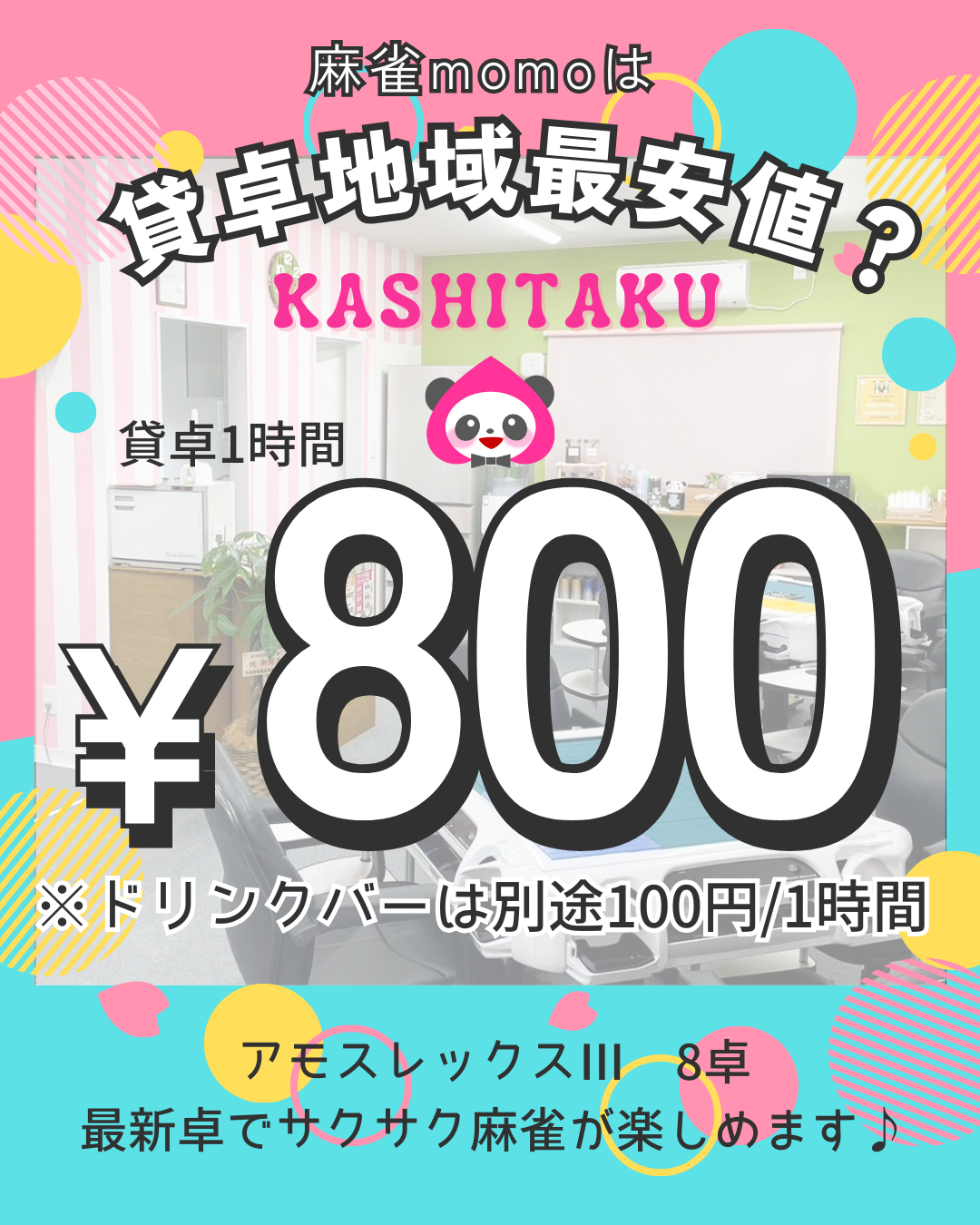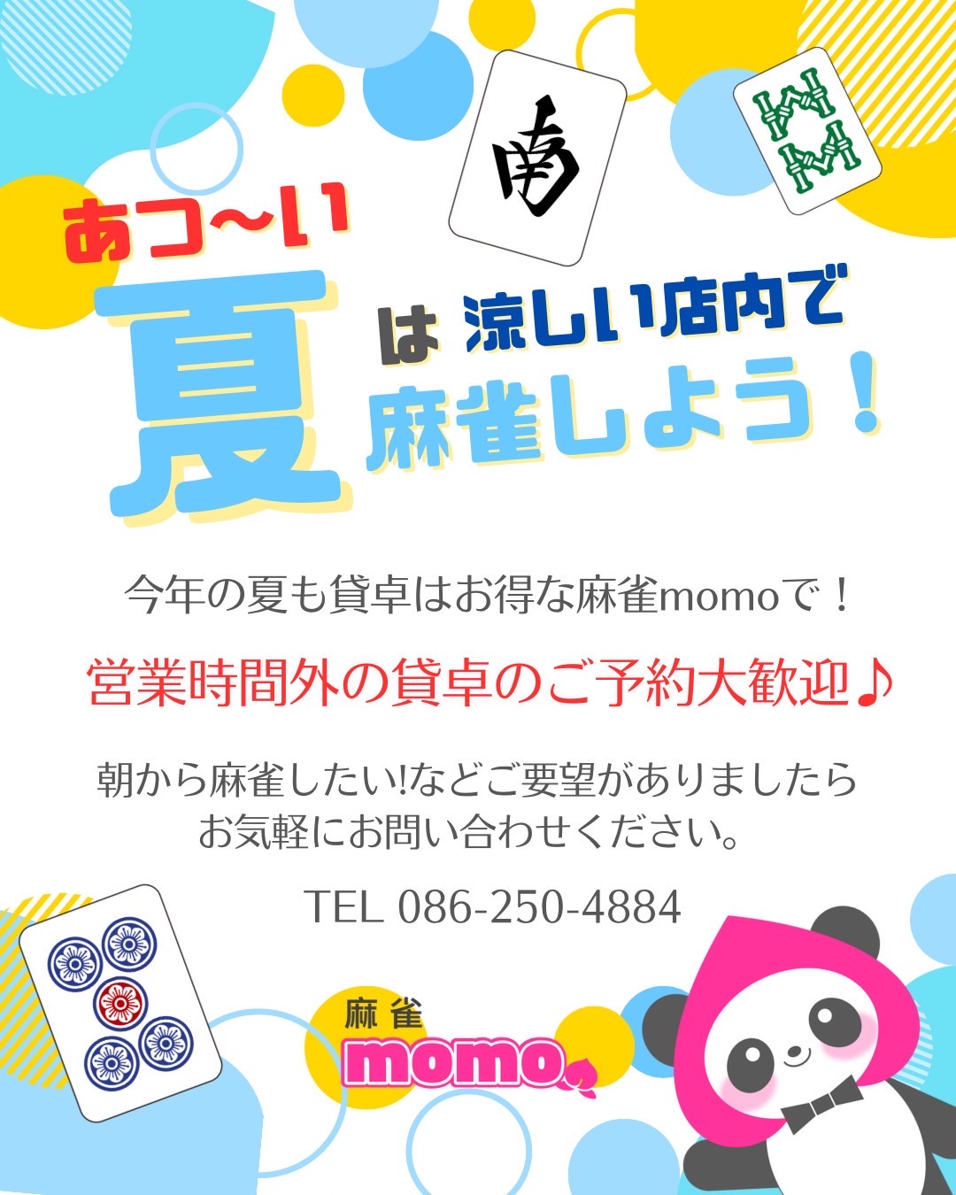 麻雀momo岡山県 マージャンモモ 岡山県 備前西市駅 徒歩15分 四麻、三麻、セット、フリー 電話する086-250-4884 地図 店舗トップ ルール 写真/動画 イベント 求人 クーポン プロ イチオシ ランキング クチコミ 総合 麻雀momo 3.0 5 7 ? 点数について 7件 詳細 雀荘クチコミの点数概要 クチコミの点数は、総合点数を中心に、全部で11項目あります。 12項目は「雀荘の営業形態についての項目」と「その他の環境についての項目」の2つにわかれます。 総合スコア (計11項目) 営業形態点数 (6項目) 雀荘の営業形態についての点数 フリー セット 健康麻雀 麻雀教室 ノーレート 三麻 その他の環境点数 (5項目) 雀荘の設備、その他の環境についての点数 設備 接客 居心地 CP(コストパフォーマンス)・清潔感 ※麻雀王国雀荘検索のクチコミの点数は、当社独自の基準に基づく評価であり、雀荘の価値を何ら保証するものではあ りません。あくまでの一つの参考としてご活用ください。 雀荘クチコミ点数の算出方法要 クチコミの点数は、「ユーザー評価」に独自のアルゴリズムで掛け合わせて算出しております。 麻雀王国では、日々信頼性の高い点数を追及し、微調整を行っております。 ユーザー評価 個人が付けた点数 (雰囲気、感性、感覚、状況、主観など) フリー3.0 セット3.0 健康麻雀- 麻雀教室- ノーレート- 三麻3.0 設備 3.0 | 接客 3.0 | 居心地 3.0 | CP(コストパフォーマンス) 3.0 | 清潔感 3.0 フリー ¥300/般 セット ¥200/般 ¥150/学 全国* 岡山県4位 全卓最新台アモスレックスⅢ全8卓🍑貸卓1時間 800円 岡山市南区米倉にある3人麻雀と貸卓のお店♪ Mリーグと同じ”最新卓"アモスレックスⅢで麻雀がお楽しみいただけます🍑 ルールも優しいものを採用しており 初心者、学生、女性の方にも気軽にご来店しやすいお店です😊 ※詳細はルールのページを御覧ください。 ※2024年6月より一部改定あり ※8月1日から2階オープンしてます! 貸卓のご予約は予約サイトからも出来ます。 詳しくは当店HPをご確認ください♪ 岡山で麻雀デビューをされるなら、ぜひ麻雀momoへ🍑 貸卓のお客様も大歓迎です🍑 皆様のご来店をお待ちしております😊 💚Mリーグと同じ最新卓で麻雀が打てます 🩷初心者の方にも優しいルールを採用 💚女性・学生割りあり 🩷無料の駐車場あり、お友達同士縦列可能です(20台程) 💚Wi-Fi環境完備 🩷スマホ、携帯、iQOS等の充電が可能 💚豊富なドリンクメニューに無料のお菓子あり 🩷貸卓のお客様営業時間外でも対応可能です 💚貸卓地域最安値 続きを見る 閉じる お店のイチオシポイント イチオシ 1 岡山県下初!全卓最新のアモスレックスⅢ導入☆ Mリーグと同じ最新の卓でご遊戯いただけます♪ ぜひお楽しみください(^^)/ イチオシ 2 初心者、学生、女性に優しいお店作り🐼 カラフルでポップな店内で、初心者や学生、女性にも優しいお店作りを徹底しております🍑 イチオシ 3 貸卓地域最安値!フリーWi-Fi、駐車場完備★ 貸卓地域最安値!? 1時間800円とお得な料金で麻雀がお楽しみいただけます。 フリーWi-Fiや広々20台の無料駐車場も完備! ドリンクメニューも充実しております♪ お店のコトを友達に教える Facebook X(旧Twitter) Line Mail お店を評価する 閉店・休業・移転・情報違い報告 クチコミ投稿 報告内容詳細※必須 閉店 休業 移転 情報違い 送信する 最新情報 2025年7月4日(金) イベント 貸卓のお客様大歓迎🍑 「ネット予約」&「チェックイン」で 来店人数×100Gもらえる! ログイン ご予約情報入力 来店日※ 2013年12月31日(火) 卓数※ 12345678910卓 予定開始※ 1:00 2:00 3:00 4:00 5:00 6:00 7:00 8:00 9:00 10:00 11:00 12:00 13:00 14:00 15:00 16:00 17:00 18:00 19:00 20:00 21:00 22:00 23:00 24:00 予定終了※ 1:00 2:00 3:00 4:00 5:00 6:00 7:00 8:00 9:00 10:00 11:00 12:00 13:00 14:00 15:00 16:00 17:00 18:00 19:00 20:00 21:00 22:00 23:00 24:00 お名前※ 携帯TEL※ メール※ ルール※ 四麻 三麻 点数※ 25000点 30000点 赤枚数※ 赤5マン01234 赤5ピン01234 赤5ソー01234 その他 チップ 焼鳥 備考 予約する クチコミ 投稿する 麻雀momo 岡山県 備前西市駅 楽しく打てるフリー雀荘 2024/08/10 (2024/08訪問) ゲスト さんのクチコミ 総合 5.0 麻雀momo 岡山県 備前西市駅 綺麗なお店でした。初心者ですがスタッフさんが手が空いてる限りついてくれて、色々教えてくれました。 2024/07/26 (2024/07訪問) ゲスト さんのクチコミ 総合 5.0 麻雀momo 岡山県 備前西市駅 雀荘ぽくない入りやすいお店。 2024/07/24 (2024/05訪問) ゲスト さんのクチコミ 総合 5.0 お店独自のHP・ソーシャル X (旧twitter) 公式LINE Instagram 自社HP お店の情報詳細 店名 麻雀momo 住所 〒700-0954 [地図] 岡山県岡山市南区米倉71-8 電話 086-250-4884 交通手段 JR宇野線 備前西市駅 徒歩15分 備前西市駅をローソン西市店、芳明幼稚園方面に南下、県道214号線を右折(すぐ左手に柳生園テニススクールがあります)。そのまま踏切まで歩き、踏切手前を左折してください。 営業時間 10:00~24:00 [平日] 10:00~24:00 [土日祝] 定休日 年中無休 年始年末を除く ※臨時休業を頂く場合もございます。 詳しくはHPやインスタに掲載し