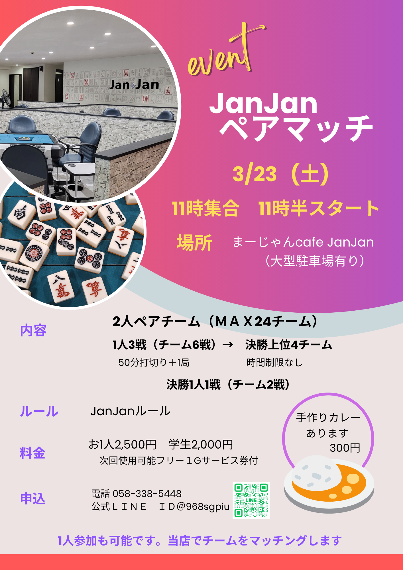 【岐阜県岐阜市・岐阜駅】まーじゃんcafe JanJanは、四麻・ノーレート・麻雀教室・健康麻雀・セット・フリーが楽しめる雀荘です。