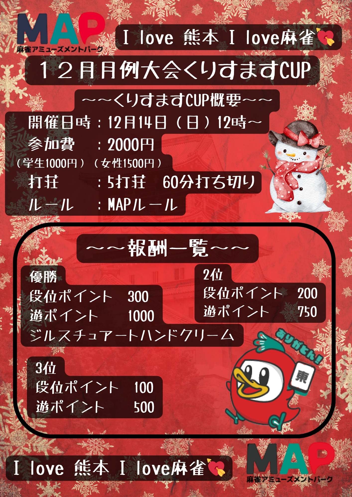 まぁじゃんMAP 熊本下通店熊本県 マージャンマップクマモトシモトオリテン 熊本県 辛島町駅 徒歩5分 フリー、ノーレート、麻雀教室、セット 電話する096-273-7798 地図 店舗トップ ルール 写真/動画 イベント 求人 クーポン プロ イチオシ ランキング クチコミ 総合 まぁじゃんMAP 熊本下通店 3.0 5 2 ? 点数について 2件 詳細 雀荘クチコミの点数概要 クチコミの点数は、総合点数を中心に、全部で11項目あります。 12項目は「雀荘の営業形態についての項目」と「その他の環境についての項目」の2つにわかれます。 総合スコア (計11項目) 営業形態点数 (6項目) 雀荘の営業形態についての点数 フリー セット 健康麻雀 麻雀教室 ノーレート 三麻 その他の環境点数 (5項目) 雀荘の設備、その他の環境についての点数 設備 接客 居心地 CP(コストパフォーマンス)・清潔感 ※麻雀王国雀荘検索のクチコミの点数は、当社独自の基準に基づく評価であり、雀荘の価値を何ら保証するものではあ りません。あくまでの一つの参考としてご活用ください。 雀荘クチコミ点数の算出方法要 クチコミの点数は、「ユーザー評価」に独自のアルゴリズムで掛け合わせて算出しております。 麻雀王国では、日々信頼性の高い点数を追及し、微調整を行っております。 ユーザー評価 個人が付けた点数 (雰囲気、感性、感覚、状況、主観など) フリー- セット3.0 健康麻雀- 麻雀教室- ノーレート- 三麻- 設備 3.0 | 接客 3.0 | 居心地 3.0 | CP(コストパフォーマンス) 3.0 | 清潔感 3.0 フリー ¥400/般 ¥200/学 セット ¥400/般 ¥150/学 MAPグループ 全国* 熊本県2位 【無料提携駐車場完備!】 お車でお越しの際はパスート24銀座プレスへ! お店から徒歩1分♪ 【ノーレートフリーはじまってます!!】 熊本MAPリーグ開幕🤗 第1期5月~7月 第2期8月~10月 第3期11月~1月 第4期2月~4月 参加条件はフリーで遊ぶだけです!!規定打荘30試合😚 無料麻雀教室開催中! お客様のご予定に合わせますので お気軽にお問い合わせ下さい😆 お一人様も大歓迎😃 セットで麻雀するなら是非当店をご利用下さい💁♀️ 平日打ち放題プラン最大12時間6000円カレー付き 土日祝日打ち放題プラン最大12時間7770 女性、シニアプランあり 学生1時間1卓600円 個室ルーム完備!!お気軽にお問い合わせ下さい💁♀️ ご予約・ご来店お待ちしてます🙇♂️ 毎日10時から営業してます😊 最新麻雀卓、地域最安値に挑戦!!最高のサービス、美味しいお食事をご用意して皆様のご来店をお待ちいたしております⭐️ 🚂🚂🚂🚂🚂🚂🚂🚂🚂🚂🚂🚂🚂🚂🚂🚂🚂 ⭐️1卓5980円で時間無制限のお酒飲み放題がつけられます❣️ ⭐️店内手作りの美味しいご飯❣️ ⭐️完全個室2部屋完備❣️ ⭐️公式LINEで簡単予約❣️ ⭐️学生大歓迎 フリー200円 セット1卓1時間600円 フリードンク ⭐️駐車場代金完全無料❣️熊本市内全域から遊びに来てください❣️*パスート24の駐車証明書が必要です 🚂🚂🚂🚂🚂🚂🚂🚂🚂🚂🚂🚂🚂🚂🚂🚂🚂 ⭐️お電話やLINEでお気軽にお問い合わせ下さい♪ 1番上にある☎️【電話する】からもスムーズにご予約&お問い合わせ可能です‼️ 続きを見る 閉じる お店のイチオシポイント イチオシ 1 清潔で居心地が良い麻雀店を目指しています。 メインホールに7卓!更に個室を2部屋ご用意しています!最新のアモスレックスⅢで快適なご遊戯をお楽しみください♪♪ イチオシ 2 公式LINEで簡単予約!! MAP熊本下通店LINE公式アカウントはじめました! 友だち追加していただくと 初回特典として、 ・お食事1品無料サービス!(最大800円相当割引!) MAP熊本下通店LINE公式アカウントでは オトクな情報を随時配信していきます! *お得なクーポンを定期的に配信 *トーク画面から予約が可能になりました! *最新の営業情報やイベント情報を随時配信していきます! コチラからお友だちになってください! ↓↓↓↓↓↓↓↓↓↓↓↓↓↓↓↓↓↓↓↓↓ イチオシ 3 飲食にこだわったご飯もおいしいお店♪ 麻雀荘でご飯なんて…と思う方も多いかもしれません でも、ご安心ください! MAPでは美味しいご飯が食べられます❣ ちょっとおつまみにたこ焼きやガッツリ食べたいときはロコモコ丼など! 豊富なメニューからお選びできます! MAPではソフトドリンクが無料で飲み放題! 更に!!アルコール飲み放題パックのご用意もあるのでお酒を飲みたいお客様のニーズにも応えちゃいます! まぁじゃんMAP熊本下通店でぜひお得で美味しいお食事と一緒に麻雀を楽しんでください( *´艸`) お店のコトを友達に教える Facebook X(旧Twitter) Line Mail お店を評価する 閉店・休業・移転・情報違い報告 クチコミ投稿 報告内容詳細※必須 閉店 休業 移転 情報違い 送信する 最新情報 2025年12月4日(木) イベント 12月月例大会クリスマスcup I love 熊本 I love 麻雀 12月月例大会クリスマスcup ~クリスマスcup概要~ 開催日時:12月14日(日)12時~ 参加費:2000円 (学生1000円)(女性1500円) 打荘:5打荘 60分打ち切り ルール:MAPルール ~報酬一覧~ 優勝 段位ポイント300 遊ポイント1000 ジルスチュアー