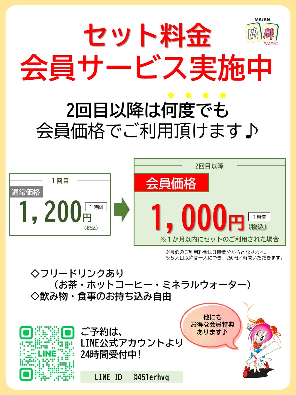 MAJAN 牌牌福岡県 マージャンパイパイ 福岡県 天神南駅 6番出口より徒歩2分 四麻、セット、フリー 電話する092-406-8244 地図 店舗トップ ルール 写真/動画 イベント 求人 クーポン プロ イチオシ ランキング クチコミ 総合 MAJAN 牌牌 - 5 0 ? 点数について 0件 詳細 雀荘クチコミの点数概要 クチコミの点数は、総合点数を中心に、全部で11項目あります。 12項目は「雀荘の営業形態についての項目」と「その他の環境についての項目」の2つにわかれます。 総合スコア (計11項目) 営業形態点数 (6項目) 雀荘の営業形態についての点数 フリー セット 健康麻雀 麻雀教室 ノーレート 三麻 その他の環境点数 (5項目) 雀荘の設備、その他の環境についての点数 設備 接客 居心地 CP(コストパフォーマンス)・清潔感 ※麻雀王国雀荘検索のクチコミの点数は、当社独自の基準に基づく評価であり、雀荘の価値を何ら保証するものではあ りません。あくまでの一つの参考としてご活用ください。 雀荘クチコミ点数の算出方法要 クチコミの点数は、「ユーザー評価」に独自のアルゴリズムで掛け合わせて算出しております。 麻雀王国では、日々信頼性の高い点数を追及し、微調整を行っております。 ユーザー評価 個人が付けた点数 (雰囲気、感性、感覚、状況、主観など) フリー- セット- 健康麻雀- 麻雀教室- ノーレート- 三麻- 設備 - | 接客 - | 居心地 - | CP(コストパフォーマンス) - | 清潔感 - フリー ¥400/般 セット ¥300/般 全国52位 福岡県1位 天神南駅6番出口より徒歩2分🚉 福岡市ではここだけ‼ 4人打ちの条件付き東南戦(スピードバトル)のお店です🀄 8月30日(土)から皆様に楽しんでいただけるようにルール変更✨️✨️ 詳しくは、”イチオシ”をご覧ください☺️♪ 只今激アツのイベント5勝戦を毎週土日のみ 1日2回開催中! 1部 12:00〜18:00 2部 18:00〜24:00 Mリーグでも採用されている最新卓『AMOS REXXⅢ』導入!!! 分煙(電子タバコ可)のキレイな店内でご遊戯いただけます(^^)/ 天神エリアで麻雀をされる際は、『MAJAN 牌牌』へ☆ 皆様のご来店をお待ちしております♪ ---- セットのご予約について---- 一般価格:1,200円/1卓1時間 会員価格:1,000円/1卓1時間 ※フリードリンク有 ※持ち込み完全自由 ※営業時間外をご希望の場合はご相談ください セットのご予約は公式LINEより24時間受け付けております。 LINE ID→@451erhvq *セット料金は3時間からとなります。 ◆◆◆◆◆◆◆◆◆◆◆◆◆◆◆◆◆◆◆ ・フリードリンク ・女性専用トイレ ・大型テレビ ・スマホ、携帯充電可 続きを見る 閉じる お店のイチオシポイント イチオシ 1 ✨️✨️激アツイベント✨️✨️ 毎週土日開催⭐️5勝戦⭐️ 1日2回開催 1部 12:00〜18:00 2部 18:00〜24:00 イチオシ 2 セット会員募集中☺️ 2回目以降がお得になる、セット料金会員サービスを実施しています☺️ ぜひご利用ください♪♪ お店のコトを友達に教える Facebook X(旧Twitter) Line Mail お店を評価する 閉店・休業・移転・情報違い報告 クチコミ投稿 報告内容詳細※必須 閉店 休業 移転 情報違い 送信する 「ネット予約」&「チェックイン」で 来店人数×100Gもらえる! ログイン ご予約情報入力 来店日※ 2013年12月31日(火) 卓数※ 12345678910卓 予定開始※ 1:00 2:00 3:00 4:00 5:00 6:00 7:00 8:00 9:00 10:00 11:00 12:00 13:00 14:00 15:00 16:00 17:00 18:00 19:00 20:00 21:00 22:00 23:00 24:00 予定終了※ 1:00 2:00 3:00 4:00 5:00 6:00 7:00 8:00 9:00 10:00 11:00 12:00 13:00 14:00 15:00 16:00 17:00 18:00 19:00 20:00 21:00 22:00 23:00 24:00 お名前※ 携帯TEL※ メール※ ルール※ 四麻 三麻 点数※ 25000点 30000点 赤枚数※ 赤5マン01234 赤5ピン01234 赤5ソー01234 その他 チップ 焼鳥 備考 予約する クチコミ 投稿する お店独自のHP・ソーシャル X (旧twitter) Instagram お店の情報詳細 店名 MAJAN 牌牌 住所 〒810-0003 [地図] 福岡県福岡市中央区春吉3丁目21-21 春野ビル4階 電話 092-406-8244 交通手段 福岡市営地下鉄七隈線 天神南駅 6番出口より徒歩2分 福岡市営地下鉄空港線 天神駅 徒歩5分 国体道路沿い 吉野家の入っているビル4F 営業時間 14:00~24:00 [平日14時00分より 木曜日定休日] 11:00~24:00 [土日祝日11時00分より] 定休日 木 営業内容 四麻、セット、フリー ゲーム代(フリー) ¥400/般 [東風戦/1回] ゲーム代(セット) ¥300/般 [【通常価格】1卓1200円/1時間 【会員価格】1卓1000円/1時間 ] ゲーム代(健康麻雀) ゲーム代(麻雀教室) その他の料金 オープン日 2024年7月6日 お店のサービス・システム・設備 総卓数 5卓 卓種 全自動配牌卓×5 サービス 女性スタッフ、自動配牌卓、フリードリンク システム・設備 女性専用トイレ、ウォシュレット、大型TV 備考 関連エリア・路線 福岡県の雀荘ランキング 天神南駅の雀荘ランキング 天神駅の雀荘ランキング 福岡県の雀荘特集 福岡県福岡市中央区の雀荘特集 天神南駅の雀荘特集 天神駅の雀荘特集 お店を利用する 電話する092-406-8244 地図福岡県福岡市中央区春吉3丁目21-21春野ビル4階 店舗トップ ルール 写真/動画 イベント 求人 クーポン プロ イチオシ ランキング ソーシャル [ 管理者ページ ]
