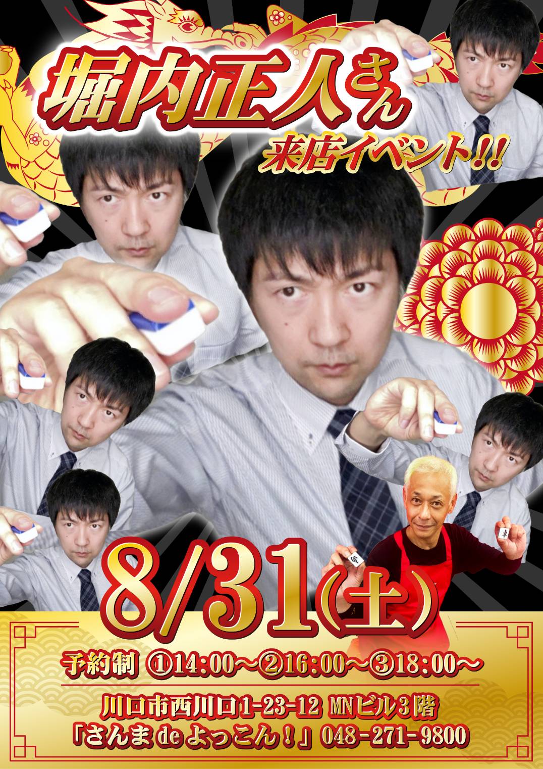 麻雀さんまdeよっこん!埼玉県 マージャンサンマデヨッコン 埼玉県 西川口駅 徒歩3分 三麻、セット、フリー 電話する04-8271-9800 地図 店舗トップ ルール 写真/動画 イベント 求人 クーポン プロ イチオシ ランキング クチコミ 総合 麻雀さんまdeよっこん! 3.0 5 6 ? 点数について 6件 詳細 雀荘クチコミの点数概要 クチコミの点数は、総合点数を中心に、全部で11項目あります。 12項目は「雀荘の営業形態についての項目」と「その他の環境についての項目」の2つにわかれます。 総合スコア (計11項目) 営業形態点数 (6項目) 雀荘の営業形態についての点数 フリー セット 健康麻雀 麻雀教室 ノーレート 三麻 その他の環境点数 (5項目) 雀荘の設備、その他の環境についての点数 設備 接客 居心地 CP(コストパフォーマンス)・清潔感 ※麻雀王国雀荘検索のクチコミの点数は、当社独自の基準に基づく評価であり、雀荘の価値を何ら保証するものではあ りません。あくまでの一つの参考としてご活用ください。 雀荘クチコミ点数の算出方法要 クチコミの点数は、「ユーザー評価」に独自のアルゴリズムで掛け合わせて算出しております。 麻雀王国では、日々信頼性の高い点数を追及し、微調整を行っております。 ユーザー評価 個人が付けた点数 (雰囲気、感性、感覚、状況、主観など) フリー3.0 セット3.0 健康麻雀3.0 麻雀教室3.0 ノーレート- 三麻3.0 設備 3.0 | 接客 3.0 | 居心地 3.0 | CP(コストパフォーマンス) 3.0 | 清潔感 3.0 フリー ¥400/般 セット ¥1,200/般 全国* 埼玉県37位 【埼玉県川口市・西川口駅】麻雀さんまdeよっこん!は、三麻・セット・フリーが楽しめる雀荘です。 ✨✨2024年8月17日新規OPEN✨✨ 【ご連絡先】 04-8271-9800 ※上記つながらない場合は下記までご連絡をいただけますようお願いいたします 店長よっこん:070-4135-5179 西川口駅から徒歩3分の超好立地!! とても綺麗な店内で麻雀を楽しめます。 全卓Mリーグでも採用されていますレックス3導入! 様々なイベントも開催予定 年中無休1時オープン!! ゲストイベント多数。 ・フリードリンク ・レックス3 ・スマホ携帯充電可 続きを見る 閉じる お店のイチオシポイント イチオシ 1 全卓レックス3 Mリーグでも採用されていますレックス3導入! イチオシ 2 金牌導入 お店のコトを友達に教える Facebook X(旧Twitter) Line Mail お店を評価する 閉店・休業・移転・情報違い報告 クチコミ投稿 報告内容詳細※必須 閉店 休業 移転 情報違い 送信する 最新情報 2024年8月26日(月) イベント 8/31(土)堀内正人さん来店!【完全予約制となります】 8/31(土)堀内正人さん来店イベント開催! 計3部制にてご予約承ります【14:00-16:00 16:00-18:00 18:00-20:00】 ご予約に関しましては店舗までお電話にてお問い合わせをいただけますようお願いいたします。 「ネット予約」&「チェックイン」で 来店人数×100Gもらえる! ログイン ご予約情報入力 来店日※ 2013年12月31日(火) 卓数※ 12345678910卓 予定開始※ 1:00 2:00 3:00 4:00 5:00 6:00 7:00 8:00 9:00 10:00 11:00 12:00 13:00 14:00 15:00 16:00 17:00 18:00 19:00 20:00 21:00 22:00 23:00 24:00 予定終了※ 1:00 2:00 3:00 4:00 5:00 6:00 7:00 8:00 9:00 10:00 11:00 12:00 13:00 14:00 15:00 16:00 17:00 18:00 19:00 20:00 21:00 22:00 23:00 24:00 お名前※ 携帯TEL※ メール※ ルール※ 四麻 三麻 点数※ 25000点 30000点 赤枚数※ 赤5マン01234 赤5ピン01234 赤5ソー01234 その他 チップ 焼鳥 備考 予約する クチコミ 投稿する 麻雀さんまdeよっこん! 埼玉県 西川口駅 気さくな店長さんと明るいスタッフさんでとても良かったです 2025/01/31 (2025/01訪問) ゲスト さんのクチコミ 総合 5.0 麻雀さんまdeよっこん! 埼玉県 西川口駅 いつもお世話になってます 50文字じゃ良い事書ききれません!フリー、セットでも是非行ってみて下さい! 2024/12/17 (2024/12訪問) ゲスト さんのクチコミ 総合 5.0 麻雀さんまdeよっこん! 埼玉県 西川口駅 カレーを無料でもらいました。聞けば毎日賄いみたいなのを食べさせてくれるらしいです。おすすめです 2024/11/21 (2024/11訪問) ゲスト さんのクチコミ 総合 5.0 お店の情報詳細 店名 麻雀さんまdeよっこん! 住所 〒332-0021 [地図] 埼玉県川口市西川口1-22-13 MNビル3F 電話 04-8271-9800 交通手段 JR京浜東北線 西川口駅 徒歩3分 営業時間 日の出~ラスト 定休日 年中無休 営業内容 三麻、セット、フリー ゲーム代(フリー) ¥400/般 [東南戦/1回] ゲーム代(セット) ¥1,200/般 [学割あります! 1月2月限定パック 平日月~木18時から23時まで 5時間パック 2000円で1日2卓ご案内!] ゲーム代(健康麻雀) ゲーム代(麻雀教室) その他の料金 セット様 御遊技代サービス強化します! 平日 オールタイム 3時間 3,000円 6時間 4,000円 10 時間 5,000円 12時間 8,000円 土日祝 オールタイム 3時間 3,500円 6時間 6,000円 10時間 8,000円 12時間 10,000円 ※1D ドリンク付き オープン日 2024年8月17日 初投稿者 ゲスト お店のサービス・システム・設備 総卓数 4卓 卓種 全自動配牌卓×4 サービス フリードリンク、自動配牌卓、パック料金、学割 システム・設備 PC、タブレット、スマホ、ネット環境、ウォシュレット 備考 関連エリア・路線 埼玉県