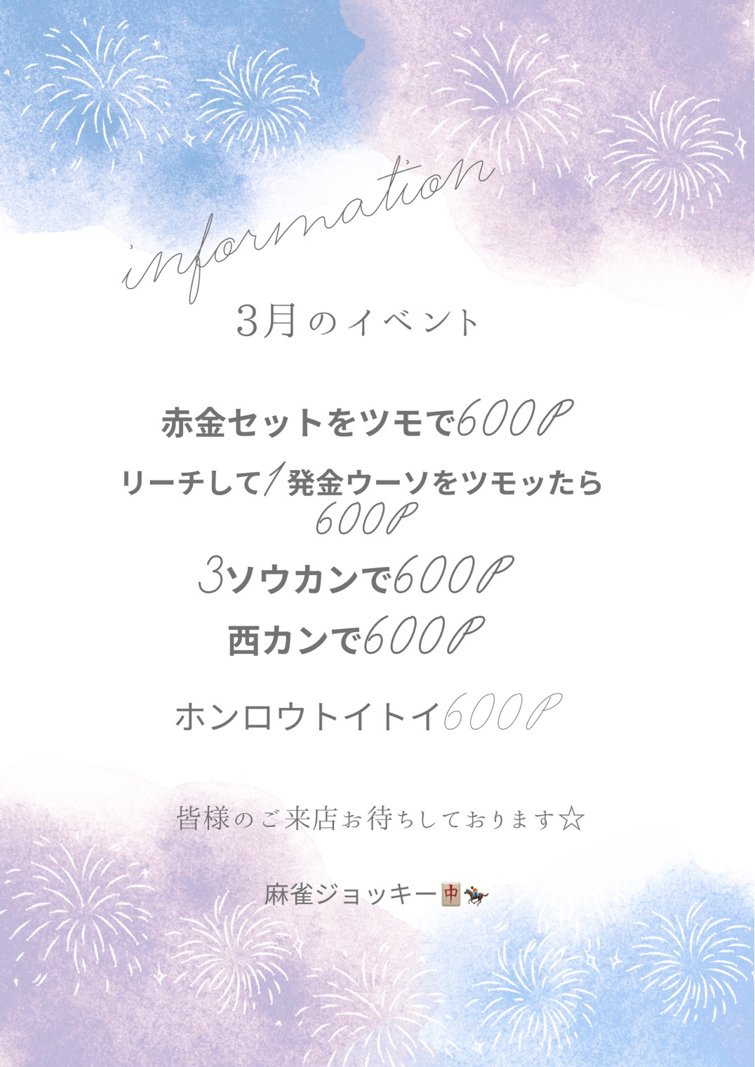 麻雀 ジョッキー神奈川県 マージャンジョッキー 神奈川県 関内駅 徒歩9分 四麻、三麻、麻雀教室、セット、フリー 電話する045-273-2692 地図 店舗トップ ルール 写真/動画 イベント 求人 クーポン プロ イチオシ ランキング クチコミ 総合 麻雀 ジョッキー 3.0 5 2 ? 点数について 2件 詳細 雀荘クチコミの点数概要 クチコミの点数は、総合点数を中心に、全部で11項目あります。 12項目は「雀荘の営業形態についての項目」と「その他の環境についての項目」の2つにわかれます。 総合スコア (計11項目) 営業形態点数 (6項目) 雀荘の営業形態についての点数 フリー セット 健康麻雀 麻雀教室 ノーレート 三麻 その他の環境点数 (5項目) 雀荘の設備、その他の環境についての点数 設備 接客 居心地 CP(コストパフォーマンス)・清潔感 ※麻雀王国雀荘検索のクチコミの点数は、当社独自の基準に基づく評価であり、雀荘の価値を何ら保証するものではあ りません。あくまでの一つの参考としてご活用ください。 雀荘クチコミ点数の算出方法要 クチコミの点数は、「ユーザー評価」に独自のアルゴリズムで掛け合わせて算出しております。 麻雀王国では、日々信頼性の高い点数を追及し、微調整を行っております。 ユーザー評価 個人が付けた点数 (雰囲気、感性、感覚、状況、主観など) フリー3.0 セット3.0 健康麻雀3.0 麻雀教室3.0 ノーレート3.0 三麻3.0 設備 3.0 | 接客 3.0 | 居心地 3.0 | CP(コストパフォーマンス) 3.0 | 清潔感 3.0 フリー ¥600/般 セット ¥300/般 ¥250/学 全国* 神奈川県41位 【神奈川県横浜市中区・関内駅】麻雀 ジョッキーは、四麻・三麻・麻雀教室・セット・フリーが楽しめる雀荘です。 ~ご来店の皆様へ~ 当店が明日8/23で1周年を迎えます✨ 1周年を記念して、明日からイベントを開催します(^^)/ 大(小)四喜を出した方に、お店より豪華特典アリ♪ 喫煙可能店舗です!! (ご連絡) 1周年記念イベント✨ 女性のお客様限定、 フリーで来店の方、 1ゲーム無料キャンペーンを はじめました🀄️ ご来店お待ちしております🙇♀️ 皆様のご来店・チャレンジをお待ちしております(*´ω`*) 関内駅徒歩9分さらに 伊勢佐木長者町駅から徒歩2分の超好立地!! 夫婦で営業しているアットホームなお店です(*´ω`*) 初心者の方、女性の方大歓迎です。 ⭐︎ただ今キャンペーン開催中⭐︎ セットのお客様 5時間パック:5,000円‼️ ※(年末年始、ゴールデンウィーク、お盆は除く) (尚、ドリンクサービスはございませんので、ドリンクのご持参よろしくお願いします。) お電話で”5時間パック希望”と お伝えください。 ご来店お待ちしております♪ オリジナル牌金ウーピン導入!! 金ウーピンに関するイベント多数 イベントページをチェック 様々な飲み物が無料やポイントカードなどサービス盛りだくさん。 今なら麻雀王国を見たと伝えてくだされば1ゲームサービス中! ・ドリンク無料 ・大型TV ・空気清浄機 ・Wi-Fi完備 続きを見る 閉じる お店のイチオシポイント イチオシ 1 ドリンク無料! オロナミンCやサイダー、デカビタがあります。 無くなり次第終了です イチオシ 2 ポイントカード お店のコトを友達に教える Facebook X(旧Twitter) Line Mail お店を評価する 閉店・休業・移転・情報違い報告 クチコミ投稿 報告内容詳細※必須 閉店 休業 移転 情報違い 送信する 最新情報 2026年3月4日(水) イベント 毎月変わるお得イベント✨ 今月のイベントはこちら! ぜひチャレンジしてください(^^)/ 「ネット予約」&「チェックイン」で 来店人数×100Gもらえる! ログイン ご予約情報入力 来店日※ 2013年12月31日(火) 卓数※ 12345678910卓 予定開始※ 1:00 2:00 3:00 4:00 5:00 6:00 7:00 8:00 9:00 10:00 11:00 12:00 13:00 14:00 15:00 16:00 17:00 18:00 19:00 20:00 21:00 22:00 23:00 24:00 予定終了※ 1:00 2:00 3:00 4:00 5:00 6:00 7:00 8:00 9:00 10:00 11:00 12:00 13:00 14:00 15:00 16:00 17:00 18:00 19:00 20:00 21:00 22:00 23:00 24:00 お名前※ 携帯TEL※ メール※ ルール※ 四麻 三麻 点数※ 25000点 30000点 赤枚数※ 赤5マン01234 赤5ピン01234 赤5ソー01234 その他 チップ 焼鳥 備考 予約する クチコミ 投稿する 麻雀 ジョッキー 神奈川県 関内駅 穴場、良店です。 2025/12/23 (2025/12訪問) ゲスト さんのクチコミ 総合 4.0 麻雀 ジョッキー 神奈川県 関内駅 新しくて良い店です。 2025/10/08 (2025/10訪問) ゲスト さんのクチコミ 総合 4.0 お店独自のHP・ソーシャル X (旧twitter) Instagram お店の情報詳細 店名 麻雀 ジョッキー 住所 〒231-0057 [地図] 神奈川県横浜市中区曙町1-9 上田ビル3F 電話 045-273-2692 交通手段 JR京浜東北線 関内駅 徒歩9分 ブルーライン 伊勢佐木長者町駅 徒歩2分 営業時間 9:00~24:30 定休日 年中無休 営業内容 四麻、三麻、麻雀教室、セット、フリー ゲーム代(フリー) ¥600/般 [東南戦] ¥400/般 [東南戦] ゲーム代(セット) ¥300/般 ¥250/学 [女性割250円] ゲーム代(健康麻雀) ゲーム代(麻雀教室) ¥3,000/般 [要予約ドリンク付き] その他の料金 オープン日 2024年8月23日 初投稿者 ゲスト お店のサービス・システム・設備 総卓数 4卓 卓種 全自動配牌卓×4 サービス フリードリンク、自動配牌卓