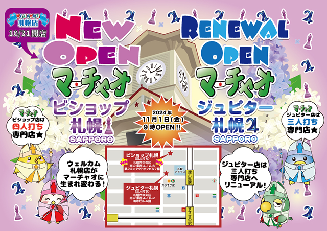マーチャオ ビショップ 札幌店北海道 マーチャオビショップサッポロテン 北海道 すすきの駅 徒歩3分 四麻、セット、フリー 電話する011-210-6161 地図 店舗トップ ルール 写真/動画 イベント 求人 クーポン プロ イチオシ ランキング クチコミ 総合 マーチャオ ビショップ 札幌店 - 5 0 ? 点数について 0件 詳細 雀荘クチコミの点数概要 クチコミの点数は、総合点数を中心に、全部で11項目あります。 12項目は「雀荘の営業形態についての項目」と「その他の環境についての項目」の2つにわかれます。 総合スコア (計11項目) 営業形態点数 (6項目) 雀荘の営業形態についての点数 フリー セット 健康麻雀 麻雀教室 ノーレート 三麻 その他の環境点数 (5項目) 雀荘の設備、その他の環境についての点数 設備 接客 居心地 CP(コストパフォーマンス)・清潔感 ※麻雀王国雀荘検索のクチコミの点数は、当社独自の基準に基づく評価であり、雀荘の価値を何ら保証するものではあ りません。あくまでの一つの参考としてご活用ください。 雀荘クチコミ点数の算出方法要 クチコミの点数は、「ユーザー評価」に独自のアルゴリズムで掛け合わせて算出しております。 麻雀王国では、日々信頼性の高い点数を追及し、微調整を行っております。 ユーザー評価 個人が付けた点数 (雰囲気、感性、感覚、状況、主観など) フリー- セット- 健康麻雀- 麻雀教室- ノーレート- 三麻- 設備 - | 接客 - | 居心地 - | CP(コストパフォーマンス) - | 清潔感 - マーチャオグループ 全国* 北海道13位 【北海道札幌市中央区・すすきの駅】マーチャオ ビショップ 札幌店は、四麻・セット・フリーが楽しめる雀荘です。 【✨2024年11月1日(金)オープン✨】 マーチャオが北海道に2店舗目をオープン(^^)/ すすきの駅から徒歩3分🚉 ビショップは【四人麻雀】のお店です🀄 ※近くにあるジュピターが三人麻雀のお店です(^^♪ 麻雀初めての方も大歓迎(^^)/ 皆様のご来店を心よりお待ちしております!! 全国チェーンのマーチャオなら、初めての方でも安心♪ 元気なスタッフがお待ちしております!! 続きを見る 閉じる お店のコトを友達に教える Facebook X(旧Twitter) Line Mail お店を評価する 閉店・休業・移転・情報違い報告 クチコミ投稿 報告内容詳細※必須 閉店 休業 移転 情報違い 送信する 「ネット予約」&「チェックイン」で 来店人数×100Gもらえる! ログイン ご予約情報入力 来店日※ 2013年12月31日(火) 卓数※ 12345678910卓 予定開始※ 1:00 2:00 3:00 4:00 5:00 6:00 7:00 8:00 9:00 10:00 11:00 12:00 13:00 14:00 15:00 16:00 17:00 18:00 19:00 20:00 21:00 22:00 23:00 24:00 予定終了※ 1:00 2:00 3:00 4:00 5:00 6:00 7:00 8:00 9:00 10:00 11:00 12:00 13:00 14:00 15:00 16:00 17:00 18:00 19:00 20:00 21:00 22:00 23:00 24:00 お名前※ 携帯TEL※ メール※ ルール※ 四麻 三麻 点数※ 25000点 30000点 赤枚数※ 赤5マン01234 赤5ピン01234 赤5ソー01234 その他 チップ 焼鳥 備考 予約する クチコミ 投稿する お店の情報詳細 店名 マーチャオ ビショップ 札幌店 住所 〒060-0062 [地図] 北海道札幌市中央区南二条西4-12-6 第2コンタクトオフビル7階 電話 011-210-6161 交通手段 札幌市営地下鉄南北線 すすきの駅 徒歩3分 札幌市営地下鉄南北線 大通駅 徒歩4分 営業時間 オープン~ラスト 定休日 年中無休 営業内容 四麻、セット、フリー ゲーム代(フリー) ゲーム代(セット) ゲーム代(健康麻雀) ゲーム代(麻雀教室) その他の料金 オープン日 2024年11月1日 お店のサービス・システム・設備 総卓数 14卓 卓種 全自動配牌卓×14 サービス フリードリンク、自動配牌卓 システム・設備 備考 関連エリア・路線 北海道の雀荘ランキング すすきの駅の雀荘ランキング 大通駅の雀荘ランキング 北海道の雀荘特集 北海道札幌市中央区の雀荘特集 すすきの駅の雀荘特集 大通駅の雀荘特集 お店を利用する 電話する011-210-6161 地図北海道札幌市中央区南二条西4-12-6第2コンタクトオフビル7階 [ 管理者ページ ]