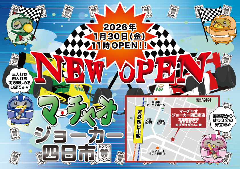 2026.01.30 オープン NEWOPENマーチャオ ジョーカー 四日市店三重県 マーチャオジョーカーヨッカイチテン 三重県 近鉄四日市駅 徒歩3分 四麻、三麻、セット、フリー 電話する070-5365-6816 地図 店舗トップ ルール 写真/動画 イベント 求人 クーポン プロ イチオシ ランキング クチコミ 総合 マーチャオ ジョーカー 四日市店 - 5 0 ? 点数について 0件 詳細 雀荘クチコミの点数概要 クチコミの点数は、総合点数を中心に、全部で11項目あります。 12項目は「雀荘の営業形態についての項目」と「その他の環境についての項目」の2つにわかれます。 総合スコア (計11項目) 営業形態点数 (6項目) 雀荘の営業形態についての点数 フリー セット 健康麻雀 麻雀教室 ノーレート 三麻 その他の環境点数 (5項目) 雀荘の設備、その他の環境についての点数 設備 接客 居心地 CP(コストパフォーマンス)・清潔感 ※麻雀王国雀荘検索のクチコミの点数は、当社独自の基準に基づく評価であり、雀荘の価値を何ら保証するものではあ りません。あくまでの一つの参考としてご活用ください。 雀荘クチコミ点数の算出方法要 クチコミの点数は、「ユーザー評価」に独自のアルゴリズムで掛け合わせて算出しております。 麻雀王国では、日々信頼性の高い点数を追及し、微調整を行っております。 ユーザー評価 個人が付けた点数 (雰囲気、感性、感覚、状況、主観など) フリー- セット- 健康麻雀- 麻雀教室- ノーレート- 三麻- 設備 - | 接客 - | 居心地 - | CP(コストパフォーマンス) - | 清潔感 - フリーの詳細情報 全国* 三重県1位 【三重県四日市市・近鉄四日市駅】マーチャオ ジョーカー 四日市店は、四麻・三麻・セット・フリーが楽しめる雀荘です。 ✨✨✨2026年1月30日(金)11時オープン✨✨✨ マーチャオが三重県に初上陸!!! ジョーカーは四人打ち、三人打ちどちらも楽しめます🀄 麻雀初めての方も大歓迎(^^)/ 皆様のご来店を心よりお待ちしております!! 続きを見る 閉じる お店のコトを友達に教える Facebook X(旧Twitter) Line Mail お店を評価する 閉店・休業・移転・情報違い報告 クチコミ投稿 報告内容詳細※必須 閉店 休業 移転 情報違い 送信する 「ネット予約」&「チェックイン」で 来店人数×100Gもらえる! ログイン ご予約情報入力 来店日※ 2013年12月31日(火) 卓数※ 12345678910卓 予定開始※ 1:00 2:00 3:00 4:00 5:00 6:00 7:00 8:00 9:00 10:00 11:00 12:00 13:00 14:00 15:00 16:00 17:00 18:00 19:00 20:00 21:00 22:00 23:00 24:00 予定終了※ 1:00 2:00 3:00 4:00 5:00 6:00 7:00 8:00 9:00 10:00 11:00 12:00 13:00 14:00 15:00 16:00 17:00 18:00 19:00 20:00 21:00 22:00 23:00 24:00 お名前※ 携帯TEL※ メール※ ルール※ 四麻 三麻 点数※ 25000点 30000点 赤枚数※ 赤5マン01234 赤5ピン01234 赤5ソー01234 その他 チップ 焼鳥 備考 予約する クチコミ 投稿する お店の情報詳細 店名 マーチャオ ジョーカー 四日市店 住所 〒510-0086 [地図] 三重県四日市市諏訪栄町5-4 四日市水谷ビル2階 電話 070-5365-6816 交通手段 近鉄内部線 近鉄四日市駅 徒歩3分 営業時間 11:00~23:00 定休日 火 営業内容 四麻、三麻、セット、フリー ゲーム代(フリー) ゲーム代(セット) [【個室】 ※喫煙可能 一般 1,760円(税込)/1時間 SSS会員 1,540円(税込)/1時間 ※学割・超学割適用不可。貸切の場合は2卓分の料金。 【通常】 一般 1,430円(税込)/1時間 SSS会員 1,210円(税込)/1時間 超学割 660円(税込)/1時間 学割 880円(税込)/1時間 ※2枚の学生証をご提示ください。 チャージ料(フリードリンク) 600円(税込)/1卓] ゲーム代(健康麻雀) ゲーム代(麻雀教室) その他の料金 オープン日 2026年1月30日 お店のサービス・システム・設備 総卓数 14卓 卓種 全自動配牌卓×14 サービス フリードリンク、自動配牌卓 システム・設備 備考 関連エリア・路線 三重県の雀荘ランキング 近鉄四日市駅の雀荘ランキング 三重県の雀荘特集 三重県四日市市の雀荘特集 近鉄四日市駅の雀荘特集 お店を利用する 電話する070-5365-6816 地図三重県四日市市諏訪栄町5-4四日市水谷ビル2階 [ 管理者ページ ]