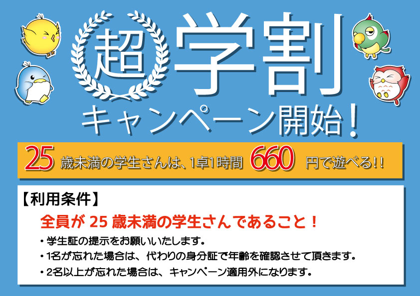 日曜9時~終日 1卓1時間 1,760円(税込)