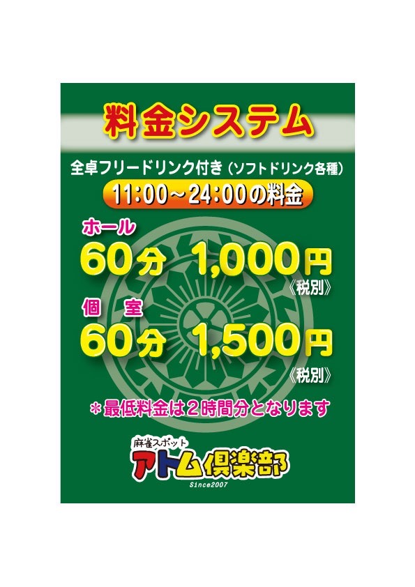 アトム倶楽部北海道 アトムクラブ 北海道 すすきの駅 189m フリー、セット、三麻 電話する011-231-9070 地図 店舗トップ ルール 写真/動画 イベント 求人 クーポン プロ イチオシ ランキング クチコミ 総合 アトム倶楽部 3.0 5 2 ? 点数について 2件 詳細 雀荘クチコミの点数概要 クチコミの点数は、総合点数を中心に、全部で11項目あります。 12項目は「雀荘の営業形態についての項目」と「その他の環境についての項目」の2つにわかれます。 総合スコア (計11項目) 営業形態点数 (6項目) 雀荘の営業形態についての点数 フリー セット 健康麻雀 麻雀教室 ノーレート 三麻 その他の環境点数 (5項目) 雀荘の設備、その他の環境についての点数 設備 接客 居心地 CP(コストパフォーマンス)・清潔感 ※麻雀王国雀荘検索のクチコミの点数は、当社独自の基準に基づく評価であり、雀荘の価値を何ら保証するものではあ りません。あくまでの一つの参考としてご活用ください。 雀荘クチコミ点数の算出方法要 クチコミの点数は、「ユーザー評価」に独自のアルゴリズムで掛け合わせて算出しております。 麻雀王国では、日々信頼性の高い点数を追及し、微調整を行っております。 ユーザー評価 個人が付けた点数 (雰囲気、感性、感覚、状況、主観など) フリー- セット3.0 健康麻雀- 麻雀教室- ノーレート- 三麻- 設備 3.0 | 接客 3.0 | 居心地 3.0 | CP(コストパフォーマンス) 3.0 | 清潔感 3.0 長期契約安心店舗 全国69位 北海道2位 2021年4月1日より麻雀王国限定のパックをご用意してます! お客様にあったパックをご用意しますので、詳しくはお電話にてお問合せください。 ※12月26日〜1月12日、4月29日〜5月6日、8月7日〜16日の期間は麻雀王国の特典割引の6時間パックは適用できません。 <当店の感染症対策につきまして> 従業員はマスクを着用して接客させていただきます。 ご理解・ご協力の程よろしくお願いいたします。 ☆2019年1月~全卓自動配牌卓導入☆ ☆麻雀王国限定割引☆ セット6時間パック フロア:5,000円(税別) 個室:7,500円(税別) ※予約時に「麻雀王国を見た」とお伝えいただた方限定のパック料金です♪♪ ☆☆日曜限定6時間個室お茶パック☆☆ 個室で6時間6,000円!(税別)月曜が祝日の場合除く ウーロン茶、緑茶、番茶が飲み放題です♪ 2019年1月~全卓自動配牌アルティマになりました☆ サクサク快適に麻雀をお楽しみいただけます! 個室のご用意もございますのでぜひご利用ください。 皆様のご来店をお待ちしております!! 続きを見る 閉じる お店のイチオシポイント イチオシ 1 お得なパック料金をご用意してます!! セット様にはお得なパック料金をご用意しております。 お客様にあったパックのご提案も可能ですので、詳しくはお電話にて問合せください。 セット6時間パック フロア:5,000円(税別) 個室:7,500円(税別) 長時間打つ時はぜひご利用ください♪♪ ※予約時に「麻雀王国を見た」とお伝えいただた方限定のパック料金です♪♪ お店のコトを友達に教える Facebook X(旧Twitter) Line Mail お店を評価する 閉店・休業・移転・情報違い報告 クチコミ投稿 報告内容詳細※必須 閉店 休業 移転 情報違い 送信する 最新情報 2016年7月4日(月) イベント 暗槓ビンゴ祭り開催中!! ただいまイベントで暗カン祭りを開催しております。 詳細は店舗にてご確認ください♪♪ 「ネット予約」&「チェックイン」で 来店人数×100Gもらえる! ログイン ご予約情報入力 来店日※ 2013年12月31日(火) 卓数※ 12345678910卓 予定開始※ 1:00 2:00 3:00 4:00 5:00 6:00 7:00 8:00 9:00 10:00 11:00 12:00 13:00 14:00 15:00 16:00 17:00 18:00 19:00 20:00 21:00 22:00 23:00 24:00 予定終了※ 1:00 2:00 3:00 4:00 5:00 6:00 7:00 8:00 9:00 10:00 11:00 12:00 13:00 14:00 15:00 16:00 17:00 18:00 19:00 20:00 21:00 22:00 23:00 24:00 お名前※ 携帯TEL※ メール※ ルール※ 四麻 三麻 点数※ 25000点 30000点 赤枚数※ 赤5マン01234 赤5ピン01234 赤5ソー01234 その他 チップ 焼鳥 備考 予約する クチコミ 投稿する アトム倶楽部 北海道 すすきの駅 ホールには壁一面に漫画がたくさんあり、個室は予想より広く快適でした。 2022/04/11 (2022/04訪問) ゲスト さんのクチコミ 総合 5.0 アトム倶楽部 北海道 すすきの駅 個室でこの値段は安かった 2021/04/08 (2021/03訪問) ゲスト さんのクチコミ 総合 5.0 お店の情報詳細 店名 アトム倶楽部 住所 〒060-0063 [地図] 北海道札幌市中央区南3条西4丁目21-10 キラク堂ビル5F 電話 011-231-9070 交通手段 札幌市営地下鉄南北線 すすきの駅 189m 札幌市電山鼻線 西4丁目駅 213m 札幌市電山鼻線 資生館小学校前駅 246m 営業時間 11:00~24:00 定休日 年中無休 12月31日、1月1日はお休み 営業内容 フリー、セット、三麻 ゲーム代(フリー) ゲーム代(セット) [フロア:1卓1時間1,000円(税別) 個室:1卓1時間1,500円(税別)] ゲーム代(健康麻雀) ゲーム代(麻雀教室) その他の料金 ☆麻雀王国限定割引☆ セット6時間パック フロア:5,000円(税別) 個室:7,500円(税別) ※予約時に「麻雀王国を見た」とお伝えいただた方限定のパック料金です♪♪ ☆☆日曜限定6時間個室お茶パック☆☆ 個室で6時間6,000円!(税別)※