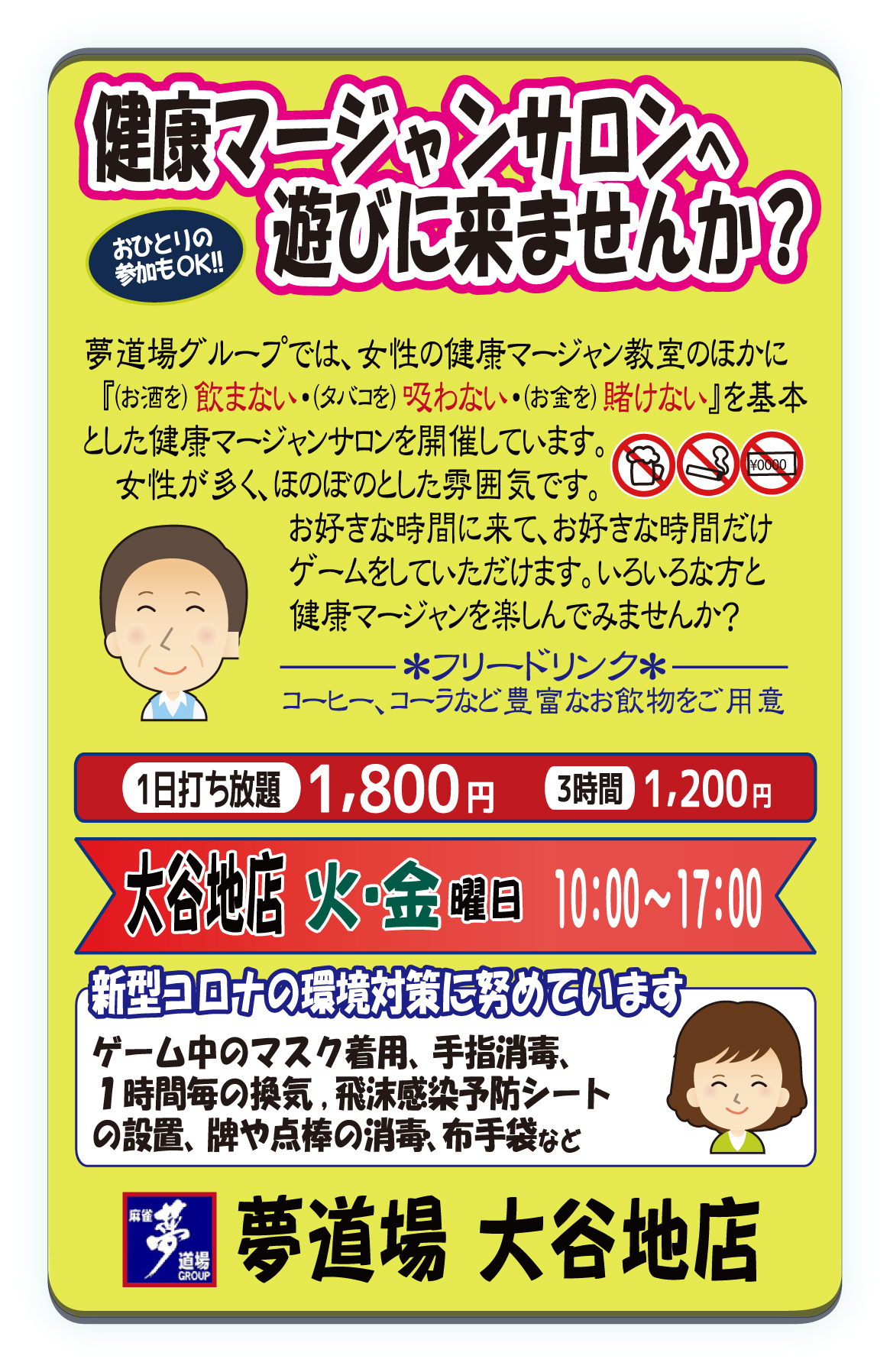 麻雀 夢道場 大谷地店北海道 マージャン ユメドウジョウ オオヤチテン 北海道 大谷地駅 徒歩5分 セット、健康麻雀、麻雀教室 電話する011-895-5533 地図 店舗トップ ルール 写真/動画 イベント 求人 クーポン プロ イチオシ ランキング クチコミ 総合 麻雀 夢道場 大谷地店 - 5 0 ? 点数について 0件 詳細 雀荘クチコミの点数概要 クチコミの点数は、総合点数を中心に、全部で11項目あります。 12項目は「雀荘の営業形態についての項目」と「その他の環境についての項目」の2つにわかれます。 総合スコア (計11項目) 営業形態点数 (6項目) 雀荘の営業形態についての点数 フリー セット 健康麻雀 麻雀教室 ノーレート 三麻 その他の環境点数 (5項目) 雀荘の設備、その他の環境についての点数 設備 接客 居心地 CP(コストパフォーマンス)・清潔感 ※麻雀王国雀荘検索のクチコミの点数は、当社独自の基準に基づく評価であり、雀荘の価値を何ら保証するものではあ りません。あくまでの一つの参考としてご活用ください。 雀荘クチコミ点数の算出方法要 クチコミの点数は、「ユーザー評価」に独自のアルゴリズムで掛け合わせて算出しております。 麻雀王国では、日々信頼性の高い点数を追及し、微調整を行っております。 ユーザー評価 個人が付けた点数 (雰囲気、感性、感覚、状況、主観など) フリー- セット- 健康麻雀- 麻雀教室- ノーレート- 三麻- 設備 - | 接客 - | 居心地 - | CP(コストパフォーマンス) - | 清潔感 - セット ¥330/般 夢道場グループ 長期契約安心店舗 全国* 北海道18位 仲間と愉しむ空間、洗練された空間の貸卓専門店です。 大谷地駅から徒歩5分かつ、300台が駐車可能な大型駐車場(無料)も完備! 徒歩でもお車でも、お気軽にご来店いただけます!! 『女性のための健康麻雀』も開催中! 麻雀を愉しみたい。 だから麻雀 夢道場 大谷地店 広さが自慢!!メニュー満載♪ 愉しめる度、満点の麻雀。 明るく広々とした店内で健康的な麻雀を!! 続きを見る 閉じる お店のイチオシポイント イチオシ 1 女性のための麻雀教室 麻雀を覚えたいけどなかなか機会がない…。 役やルールはだいたい分かるけど点数が計算できない…。 麻雀をもっともっと詳しく知りたい。 などと思っている女性は 決して少なくないと考えていました。 そして、そんな女性が安心して通える麻雀教室をご用意しました。 女性のための麻雀教室の詳細はコチラ イチオシ 2 豊富で美味しいお食事ご用意しております!! 設備の整った厨房にて手作りフードメニュー多数!! 一番人気は元帝国ホテル監修の 特製ビーフカレー!! ソフトクリームも各種あります♪ 詳細メニューはコチラ♪ お店のコトを友達に教える Facebook X(旧Twitter) Line Mail お店を評価する 閉店・休業・移転・情報違い報告 クチコミ投稿 報告内容詳細※必須 閉店 休業 移転 情報違い 送信する 最新情報 2024年11月28日(木) イベント シルバーパック【要予約】 【ホール限定・要予約】シルバーパック 平日限定 10:00~17:00 料金:5600円(1,400円×4名) ソフトドリンク1杯付き 4名様中60歳以上の方が2名いらっしゃればご予約いただけます。 (※ご来店の際、年齢を確認できるものをご提示ください) 「ネット予約」&「チェックイン」で 来店人数×100Gもらえる! ログイン ご予約情報入力 来店日※ 2013年12月31日(火) 卓数※ 12345678910卓 予定開始※ 1:00 2:00 3:00 4:00 5:00 6:00 7:00 8:00 9:00 10:00 11:00 12:00 13:00 14:00 15:00 16:00 17:00 18:00 19:00 20:00 21:00 22:00 23:00 24:00 予定終了※ 1:00 2:00 3:00 4:00 5:00 6:00 7:00 8:00 9:00 10:00 11:00 12:00 13:00 14:00 15:00 16:00 17:00 18:00 19:00 20:00 21:00 22:00 23:00 24:00 お名前※ 携帯TEL※ メール※ ルール※ 四麻 三麻 点数※ 25000点 30000点 赤枚数※ 赤5マン01234 赤5ピン01234 赤5ソー01234 その他 チップ 焼鳥 備考 予約する クチコミ 投稿する お店独自のHP・ソーシャル 自社HP お店の情報詳細 店名 麻雀 夢道場 大谷地店 住所 〒004-0042 [地図] 北海道札幌市厚別区大谷地西1丁目2番1号 電話 011-895-5533 交通手段 札幌市営地下鉄東西線 大谷地駅 徒歩5分 営業時間 10:00~ 定休日 年中無休 営業内容 セット、健康麻雀、麻雀教室 ゲーム代(フリー) ゲーム代(セット) ¥330/般 [ホール:1時間1320円 (お1人様330円×4名) 個室:1時間1760円 (お1人様440円×4名) VIP:1時間2080円 (お1人様520円×4名) 学割 5600円/1回 1卓6時間¥5200の学割パックやってます。(2人以上の学生証の提示が必要です)] ゲーム代(健康麻雀) ゲーム代(麻雀教室) ¥19,200/般 [1期3ヶ月(12回)分の料金です。 詳細はイチオシページにて!] その他の料金 【シルバーパック】 4名中60歳以上の方が2名いらっしゃればご予約頂けます。5600円(税込) 【ホール限定】 春六、夏六、秋六、冬六プラン 6時間貸し卓料金+1ドリンク(ビールOK)&1フード!10800円 【ホール限定】学割パック 料金:学割パック 6時間5600円 オープン日 お店のサービス・システム・設備 総卓数 20卓 卓種 サービス シルバー割、パック料金、駐車場、女性スタッフ、学割、女性割 システム・設備 個室 備考 無料駐車場を300台!!ご用意しております。 関連エリア・路線 北