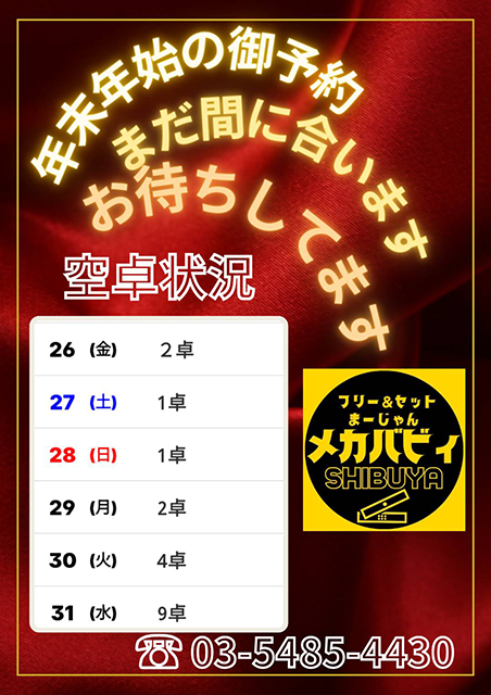 メカバビィ東京都 メカバビィ 東京都 渋谷駅 ハチ公口から徒歩1分 フリー、セット 電話する03-5485-4430 地図 店舗トップ ルール 写真/動画 イベント 求人 クーポン プロ イチオシ ランキング クチコミ 総合 メカバビィ 3.0 5 13 ? 点数について 13件 詳細 雀荘クチコミの点数概要 クチコミの点数は、総合点数を中心に、全部で11項目あります。 12項目は「雀荘の営業形態についての項目」と「その他の環境についての項目」の2つにわかれます。 総合スコア (計11項目) 営業形態点数 (6項目) 雀荘の営業形態についての点数 フリー セット 健康麻雀 麻雀教室 ノーレート 三麻 その他の環境点数 (5項目) 雀荘の設備、その他の環境についての点数 設備 接客 居心地 CP(コストパフォーマンス)・清潔感 ※麻雀王国雀荘検索のクチコミの点数は、当社独自の基準に基づく評価であり、雀荘の価値を何ら保証するものではあ りません。あくまでの一つの参考としてご活用ください。 雀荘クチコミ点数の算出方法要 クチコミの点数は、「ユーザー評価」に独自のアルゴリズムで掛け合わせて算出しております。 麻雀王国では、日々信頼性の高い点数を追及し、微調整を行っております。 ユーザー評価 個人が付けた点数 (雰囲気、感性、感覚、状況、主観など) フリー3.0 セット3.0 健康麻雀3.0 麻雀教室3.0 ノーレート3.0 三麻3.0 設備 3.0 | 接客 3.0 | 居心地 3.0 | CP(コストパフォーマンス) 3.0 | 清潔感 3.0 フリー ¥500/般 セット ¥350/般 ¥300/学 ま~じゃん パーク グループ 長期契約安心店舗 全国59位 東京都43位 【東京都渋谷区・渋谷駅】メカバビィは、フリー・セットが楽しめる雀荘です。 JR渋谷駅ハチ公口より徒歩1分 駅から最も近い雀荘です。 フリーもセットも渋谷で麻雀するならメカバビィへ(^^)/ オープンチャットの登録もよろしくお願いしますm(_ _)m ※写真/動画欄の画像より登録できます ✨️ゲスト来店情報✨️ 10月6日逢坂なつみプロご来店! レックスⅢ6卓、レックス3卓、アルティマ5卓完備 セット料金、地域最安値を目指して、期間限定割引開始します♪ 毎週月曜日〜金曜日(祝日、祝前日を除く) 12:00〜18:00 ♦︎アルティマ卓 ¥800/1h ♦︎レックス卓 ¥1000/1h ♦︎レックスIII卓 ¥1200/1h ■学生証2枚以上 ¥500/1h(アルティマ卓) ■麻雀プロ1名以上 ¥700/1h(アルティマ卓) ※学生、プロ割引はアルティマ卓に限ります ※18:00以降は通常料金になります 皆様のご予約をお待ちしております(*´ω`*) 渋谷イベント情報 9月はフリーセット共に めちゃくちゃ豪華なクジ引きイベント開催致します! 馬場裕一プロ、 まだメカバビィは頑張っております。 バビィの名前なんとか残したく頑張ってます。 バビィ由縁の皆様、ご来店お待ちしております。 渋谷メカバビィといえば!! 東南戦、赤6枚!オーソドックスルール 通常ルール ポイントカード50Pでお店からとーっても素敵な特典あり!!!!✨ メカバビィTwitter配信始めました☆ @mecha_shibuya 𝐈𝐧𝐬𝐭𝐚𝐠𝐫𝐚𝐦もあるよ! shibuyamekdababii https://instagram.com/shibuyamekababii?igshid=YmMyMTA2M2Y= リアルタイムお得な情報配信中! 続きを見る 閉じる お店のイチオシポイント イチオシ 1 ご新規様、久しぶり来店のお客様にゲーム代サービス! 新規で来店のお客様には5ゲーム無料券や!1日ゲーム代半額券!も配布中 1ヶ月以上間を空けてご来店のお客様は3ゲーム、ゲーム代をサービスしちゃいます♪ また、お久しぶりやご新規様限定のお得なポイントレースも開催中!!! イチオシ 2 セット様イベント ご予約してご来店のセット様には特典としてアルコールお1人様1杯ずつ無料です! お店のコトを友達に教える Facebook X(旧Twitter) Line Mail お店を評価する 閉店・休業・移転・情報違い報告 クチコミ投稿 報告内容詳細※必須 閉店 休業 移転 情報違い 送信する 最新情報 2025年12月22日(月) イベント ✨POINT RACE開催中✨ ※詳細に関しては、添付画像・店頭でご確認くださいm(_ _)m 「ネット予約」&「チェックイン」で 来店人数×100Gもらえる! ログイン ご予約情報入力 来店日※ 2013年12月31日(火) 卓数※ 12345678910卓 予定開始※ 1:00 2:00 3:00 4:00 5:00 6:00 7:00 8:00 9:00 10:00 11:00 12:00 13:00 14:00 15:00 16:00 17:00 18:00 19:00 20:00 21:00 22:00 23:00 24:00 予定終了※ 1:00 2:00 3:00 4:00 5:00 6:00 7:00 8:00 9:00 10:00 11:00 12:00 13:00 14:00 15:00 16:00 17:00 18:00 19:00 20:00 21:00 22:00 23:00 24:00 お名前※ 携帯TEL※ メール※ ルール※ 四麻 三麻 点数※ 25000点 30000点 赤枚数※ 赤5マン01234 赤5ピン01234 赤5ソー01234 その他 チップ 焼鳥 備考 予約する クチコミ 投稿する メカバビィ 東京都 渋谷駅 コスパがよく、麻雀を楽しむにはすごくちょうどいい店です。 2023/07/06 (2023/07訪問) ゲスト さんのクチコミ 総合 5.0 メカバビィ 東京都 渋谷駅 親しみやすい 2022/08/25 (2022/08訪問) ゲスト さんのクチコミ 総合 4.0 メカバビィ 東京都 渋谷駅 渋谷駅近くてこの料金は安い 2022/07/19 (2022/07訪問) ゲスト さんのクチコミ 総合 5.0 お店独自のHP・ソーシャル X (旧twitter) 公式LINE Instagram 自社HP 自社Facebook お店の情報詳細 店名 メカバビィ 住所 〒150-0002 [地図] 