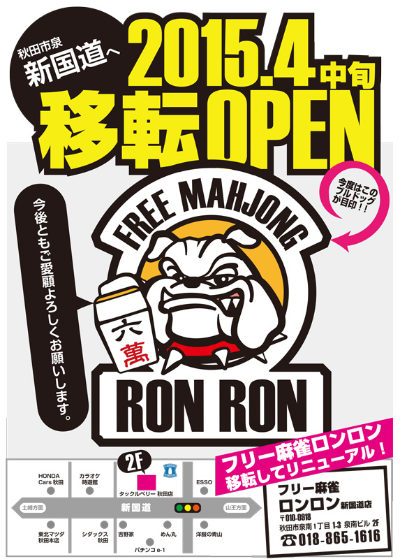 フリー麻雀 ロンロン秋田県 フリーマージャン ロンロン 秋田県 秋田駅 2.45km フリー、セット 電話する018-865-1616 地図 店舗トップ ルール 写真/動画 イベント 求人 クーポン プロ イチオシ ランキング クチコミ 総合 フリー麻雀 ロンロン 3.0 5 2 ? 点数について 2件 詳細 雀荘クチコミの点数概要 クチコミの点数は、総合点数を中心に、全部で11項目あります。 12項目は「雀荘の営業形態についての項目」と「その他の環境についての項目」の2つにわかれます。 総合スコア (計11項目) 営業形態点数 (6項目) 雀荘の営業形態についての点数 フリー セット 健康麻雀 麻雀教室 ノーレート 三麻 その他の環境点数 (5項目) 雀荘の設備、その他の環境についての点数 設備 接客 居心地 CP(コストパフォーマンス)・清潔感 ※麻雀王国雀荘検索のクチコミの点数は、当社独自の基準に基づく評価であり、雀荘の価値を何ら保証するものではあ りません。あくまでの一つの参考としてご活用ください。 雀荘クチコミ点数の算出方法要 クチコミの点数は、「ユーザー評価」に独自のアルゴリズムで掛け合わせて算出しております。 麻雀王国では、日々信頼性の高い点数を追及し、微調整を行っております。 ユーザー評価 個人が付けた点数 (雰囲気、感性、感覚、状況、主観など) フリー3.0 セット3.0 健康麻雀- 麻雀教室- ノーレート- 三麻3.0 設備 3.0 | 接客 3.0 | 居心地 3.0 | CP(コストパフォーマンス) 3.0 | 清潔感 3.0 フリー ¥600/般 セット ¥1,000/般 ¥800/学 長期契約安心店舗 フリーの詳細情報 全国* 秋田県3位 ☆12周年記念イベント 2021年2月28日(日)開催決定!!☆ 2月28日(日)に12周年記念イベント 開催決定!! 当日はゲストに宮内こずえプロ・和泉由希子プロが来店!! 皆様のご来店をお待ちしております♪♪ 秋田駅前より2015年4月移転オープン!! 女性のお客様、初心者のお客様でも、気軽に楽しめるお店です♪♪ 毎月各種イベントを開催しており、ただいまセット打ち放題プランを実施中!! 通常よりかなりの激安価格でお得にセット麻雀をお楽しみ頂けます。 その他にもご新規様紹介特典やポイント管理などで お得に楽しく遊べるサービスが盛り沢山♪♪ 秋田で麻雀するならフリー麻雀ロンロンにキマリ! 続きを見る 閉じる お店のイチオシポイント イチオシ 1 毎月各種イベントを開催しております!! 毎月各種イベントの開催、ポイント管理による来店ポイント、ゲームポイント、各種ポイントサービスを実施しております。 イチオシ 2 セット・フリー共にドリンク無料飲み放題!! セット・フリー共にドリンク無料飲み放題となっております。 イチオシ 3 麻雀最強戦加盟店!! 毎年麻雀最強戦予選を開催。 皆様のご参加をお待ちしてます!! 予選の申し込みはコチラ↓ 麻雀最強戦予選申し込みページ お店のコトを友達に教える Facebook X(旧Twitter) Line Mail お店を評価する 閉店・休業・移転・情報違い報告 クチコミ投稿 報告内容詳細※必須 閉店 休業 移転 情報違い 送信する 最新情報 2020年12月29日(火) イベント 12周年記念!宮内こずえプロ、和泉由希子プロゲスト来店♪ 12周年イベントとして、ビッグゲストをお呼び致します! 2021年2月28日12時~ 日本プロ麻雀連盟 宮内こずえプロ 日本プロ麻雀連盟 和泉由希子プロ なんとダブルゲストです。皆様是非お越し下さい♪ 「ネット予約」&「チェックイン」で 来店人数×100Gもらえる! ログイン ご予約情報入力 来店日※ 2013年12月31日(火) 卓数※ 12345678910卓 予定開始※ 1:00 2:00 3:00 4:00 5:00 6:00 7:00 8:00 9:00 10:00 11:00 12:00 13:00 14:00 15:00 16:00 17:00 18:00 19:00 20:00 21:00 22:00 23:00 24:00 予定終了※ 1:00 2:00 3:00 4:00 5:00 6:00 7:00 8:00 9:00 10:00 11:00 12:00 13:00 14:00 15:00 16:00 17:00 18:00 19:00 20:00 21:00 22:00 23:00 24:00 お名前※ 携帯TEL※ メール※ ルール※ 四麻 三麻 点数※ 25000点 30000点 赤枚数※ 赤5マン01234 赤5ピン01234 赤5ソー01234 その他 チップ 焼鳥 備考 予約する クチコミ 投稿する フリー麻雀 ロンロン 秋田県 秋田駅 すばらしい!雀荘でした! 2018/11/26 (2018/07訪問) ゲスト さんのクチコミ 総合 5.0 フリー麻雀 ロンロン 秋田県 秋田駅 秋田で本物の麻雀をするならココでしょう! 2017/05/20 (2017/05訪問) ゲスト さんのクチコミ 総合 5.0 お店独自のHP・ソーシャル 自社HP お店の情報詳細 店名 フリー麻雀 ロンロン 住所 〒010-0918 [地図] 秋田県秋田市泉南1-1-3 泉南ビル2F 電話 018-865-1616 交通手段 秋田新幹線 秋田駅 2.45km JR奥羽本線(新庄~青森) 秋田駅 2.47km 秋田駅から車で約10分。新国道沿いにある釣り具屋タックリベリーさんの2Fです。 営業時間 12:00~24:00 定休日 年中無休 営業内容 フリー、セット ゲーム代(フリー) ¥600/般 [東南戦/1回] ゲーム代(セット) ¥1,000/般 ¥800/学 ゲーム代(健康麻雀) ゲーム代(麻雀教室) その他の料金 オープン日 2015年4月21日 初投稿者 ゲスト お店のサービス・システム・設備 総卓数 8卓 卓種 全自動配牌卓×8 サービス フリードリンク、自動配牌卓、パック料金、駐車場、学割 システム・設備 女性専用トイレ、ウォシュレット 備考 関連エリア・路線 秋田県の雀荘ラ