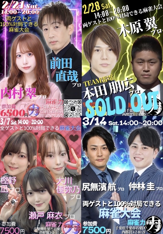 麻雀 力(りき)千葉県 マージャン リキ 千葉県 都賀駅 西口から徒歩30秒 ノーレート、フリー、セット、麻雀教室 電話する043-287-9944 地図 店舗トップ ルール 写真/動画 イベント 求人 クーポン プロ イチオシ ランキング クチコミ 総合 麻雀 力(りき) 3.0 5 21 ? 点数について 21件 詳細 雀荘クチコミの点数概要 クチコミの点数は、総合点数を中心に、全部で11項目あります。 12項目は「雀荘の営業形態についての項目」と「その他の環境についての項目」の2つにわかれます。 総合スコア (計11項目) 営業形態点数 (6項目) 雀荘の営業形態についての点数 フリー セット 健康麻雀 麻雀教室 ノーレート 三麻 その他の環境点数 (5項目) 雀荘の設備、その他の環境についての点数 設備 接客 居心地 CP(コストパフォーマンス)・清潔感 ※麻雀王国雀荘検索のクチコミの点数は、当社独自の基準に基づく評価であり、雀荘の価値を何ら保証するものではあ りません。あくまでの一つの参考としてご活用ください。 雀荘クチコミ点数の算出方法要 クチコミの点数は、「ユーザー評価」に独自のアルゴリズムで掛け合わせて算出しております。 麻雀王国では、日々信頼性の高い点数を追及し、微調整を行っております。 ユーザー評価 個人が付けた点数 (雰囲気、感性、感覚、状況、主観など) フリー3.0 セット3.0 健康麻雀3.0 麻雀教室3.0 ノーレート3.0 三麻3.0 設備 3.0 | 接客 3.0 | 居心地 3.0 | CP(コストパフォーマンス) 3.0 | 清潔感 3.0 フリー ¥400/般 セット ¥250/般 ¥200/学 長期契約安心店舗 全国67位 千葉県3位 【千葉県千葉市若葉区・都賀駅】麻雀 力(りき)は、ノーレート・フリー・セット・麻雀教室が楽しめる雀荘です。 ☆2023年7/1 リニューアルオープン☆ Mリーグルールノーレートフリー専門店に生まれ変わりました。 JR都賀駅西口から徒歩30秒の駅チカ雀荘です!! ぜひ麻雀力へお越しください♪♪ 当店は「お客様に気持ち良く過ごして頂ける麻雀店」をモットーに日々努力しております。 女性のお客様、お一人様もノーレートフリーなので、お気軽にご来店ください。 毎週土曜日にMリーガーなどの有名プロと100%対局出来る麻雀大会も開催しております。 ぜひご参加ください♪♪ 続きを見る 閉じる お店のイチオシポイント イチオシ 1 Mリーガーと100%対局できる麻雀大会開催中! 毎週開催している 有名プロと100%対局できる麻雀大会。 日吉辰哉 プロ 東城りお プロ 二階堂亜樹 プロ 二階堂瑠美 プロ 多井隆晴 プロ 松ヶ瀬隆弥 プロ 佐々木寿人 プロ 萩原聖人 プロ 渋川難波 プロ 土田浩翔 プロ 黒沢咲 プロ 勝又健志 プロ 松本吉弘 プロ 日向藍子 プロ 猿川真寿 プロ 渡辺太 プロ 襟川麻衣子 プロ 村上淳 プロ 丸山奏子 プロ 藤崎智 プロ 松嶋桃 プロ 本田朋広 プロ 瀬戸熊直樹 プロ 醍醐大 プロ 石橋伸洋 プロ 和久津晶 プロ 沢崎誠 プロ 小林剛 プロ 茅森早香 プロ 鈴木大介 プロ 堀慎吾 プロ 園田賢 プロ 浅井堂岐 プロ 鈴木優 プロ 仲林圭 プロ 滝沢和典 プロ 魚谷侑未 プロ 鈴木たろう プロ 浅見真紀 プロ 菅原千瑛 プロ 内川幸太郎 プロ 朝倉康心 プロ 河野直也 プロ 白鳥翔 プロ 瑞原明奈 プロ 前原雄大プロ 古橋崇志 プロ 小林未沙 さん HIRO柴田プロ 藤沢晴信 プロ 竹内元太 プロ 下石戟プロ 逢川恵夢プロ 高宮まりプロ 阿久津翔太プロ 三浦智博プロ 木下遥プロ 川上レイ プロ 梶梨沙子プロ 来店済み。 今後もMリーグ関係プロ 続々来店予定です。 イチオシ 2 Mリーグルールノーレートフリー専門店に生まれ変わりました。 2023年7月1日より、当店は Mリーグルールノーレートフリー専門店に生まれ変わりました。 イチオシ 3 IKUSA団体戦に「TEAM麻雀 力」参戦中! 麻雀 力は、IKUSA団体戦に参戦中! 「TEAM麻雀 力」は、「協会のグランドスラム(雀王戦・雀竜位戦・日本オープン優勝)」達成の矢島亨プロ、シンデレラファイト、桜蕾戦優勝の鴨舞プロ、WRCリーグ・桜蕾戦優勝の朝比奈ゆりプロとタイトルホルダー揃い。応援宜しくお願い致します。 お店のコトを友達に教える Facebook X(旧Twitter) Line Mail お店を評価する 閉店・休業・移転・情報違い報告 クチコミ投稿 報告内容詳細※必須 閉店 休業 移転 情報違い 送信する 最新情報 2026年1月24日(土) イベント ほりぽよ&まつもってぃと100%対局できる麻雀大会🀄️ KADOKAWAサクラナイツ 所属 堀慎吾 プロ & 渋谷ABEMAS 所属 松本吉弘 プロ がご来店! 阪神大賞典と唐津モーターボート大賞の観戦付き🐎🚤 お二人と必ず同卓できます。 こちらのイベントは完売となっております。 「ネット予約」&「チェックイン」で 来店人数×100Gもらえる! ログイン ご予約情報入力 来店日※ 2013年12月31日(火) 卓数※ 12345678910卓 予定開始※ 1:00 2:00 3:00 4:00 5:00 6:00 7:00 8:00 9:00 10:00 11:00 12:00 13:00 14:00 15:00 16:00 17:00 18:00 19:00 20:00 21:00 22:00 23:00 24:00 予定終了※ 1:00 2:00 3:00 4:00 5:00 6:00 7:00 8:00 9:00 10:00 11:00 12:00 13:00 14:00 15:00 16:00 17:00 18:00 19:00 20:00 21:00 22:00 23:00 24:00 お名前※ 携帯TEL※ メール※ ルール※ 四麻 三麻 点数※ 25000点 30000点 赤枚数※ 赤5マン01234 赤5ピン01234 赤5