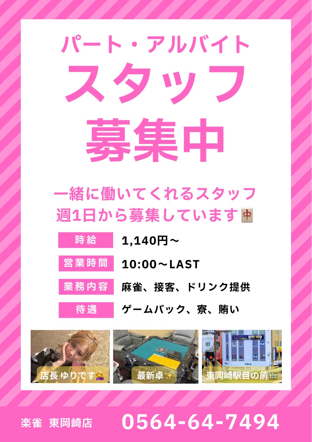 楽雀 東岡崎店愛知県 ラクジャン ヒガシオカザキテン 愛知県 東岡崎駅 徒歩15秒 三麻、フリー、セット 電話する0564-64-7494 地図 店舗トップ ルール 写真/動画 イベント 求人 クーポン プロ イチオシ ランキング クチコミ 総合 楽雀 東岡崎店 3.0 5 2 ? 点数について 2件 詳細 雀荘クチコミの点数概要 クチコミの点数は、総合点数を中心に、全部で11項目あります。 12項目は「雀荘の営業形態についての項目」と「その他の環境についての項目」の2つにわかれます。 総合スコア (計11項目) 営業形態点数 (6項目) 雀荘の営業形態についての点数 フリー セット 健康麻雀 麻雀教室 ノーレート 三麻 その他の環境点数 (5項目) 雀荘の設備、その他の環境についての点数 設備 接客 居心地 CP(コストパフォーマンス)・清潔感 ※麻雀王国雀荘検索のクチコミの点数は、当社独自の基準に基づく評価であり、雀荘の価値を何ら保証するものではあ りません。あくまでの一つの参考としてご活用ください。 雀荘クチコミ点数の算出方法要 クチコミの点数は、「ユーザー評価」に独自のアルゴリズムで掛け合わせて算出しております。 麻雀王国では、日々信頼性の高い点数を追及し、微調整を行っております。 ユーザー評価 個人が付けた点数 (雰囲気、感性、感覚、状況、主観など) フリー3.0 セット3.0 健康麻雀- 麻雀教室- ノーレート3.0 三麻3.0 設備 3.0 | 接客 3.0 | 居心地 3.0 | CP(コストパフォーマンス) 3.0 | 清潔感 3.0 フリー ¥600/般 ¥500/学 セット ¥400/般 楽雀グループ 長期契約安心店舗 全国* 愛知県16位 【愛知県岡崎市・東岡崎駅】楽雀 東岡崎店は、三麻・フリー・セットが楽しめる雀荘です。 ✨✨✨✨✨✨✨✨✨✨✨✨✨✨✨✨✨ 最新卓 REXXⅢ 導入完了°˖✧◝(⁰▿⁰)◜✧˖° 最新卓でみんなで遊びませんか?(^▽^)/ ✨✨✨✨✨✨✨✨✨✨✨✨✨✨✨✨✨ 楽雀は年中無休で朝10時から営業しております(=゚ω゚)ノ いつでもお気軽にご来店くださいませ♪ 続きを見る 閉じる お店のイチオシポイント イチオシ 1 フリーご新規様大特典💕(御紹介者様にも) フリーのご新規のお客様には、なんと 次回から使える20G無料券をプレゼント致します💕 フリーのお友達を紹介頂いた御紹介者にも1人紹介毎に20G無料券を何SETでもプレゼント致します〜(∩´∀`∩)💕 三河地区で一番無料G券を出すと評判なのは伊達じゃありません(♡ >ω< ♡) イチオシ 2 フリー&貸卓のお客様、無料駐車場を御用意♪ 東岡崎駅前の駐車場を御用意出来ました♪ 貸卓のお客様は必ず1台で乗り合わせで御来店下さい。 【米坂駐車場】 岡崎市明大寺町2丁目6番地 フリーのお客様 →7番、10番、11番、28番、30番、32番 貸卓のお客様→37番(縦列2台分) ※一目で解る大きな楽雀看板が上記番号場所に付いております♪ イチオシ 3 毎月イベント更新中( *´艸`) 月替わりでイベントやってます(*^▽^*) 大量の無料ゲーム券ゲットのチャンス♪ ゲーム券でお得に遊べますので、ぜひイベントに参加してください(/・ω・)/ お店のコトを友達に教える Facebook X(旧Twitter) Line Mail お店を評価する 閉店・休業・移転・情報違い報告 クチコミ投稿 報告内容詳細※必須 閉店 休業 移転 情報違い 送信する 「ネット予約」&「チェックイン」で 来店人数×100Gもらえる! ログイン ご予約情報入力 来店日※ 2013年12月31日(火) 卓数※ 12345678910卓 予定開始※ 1:00 2:00 3:00 4:00 5:00 6:00 7:00 8:00 9:00 10:00 11:00 12:00 13:00 14:00 15:00 16:00 17:00 18:00 19:00 20:00 21:00 22:00 23:00 24:00 予定終了※ 1:00 2:00 3:00 4:00 5:00 6:00 7:00 8:00 9:00 10:00 11:00 12:00 13:00 14:00 15:00 16:00 17:00 18:00 19:00 20:00 21:00 22:00 23:00 24:00 お名前※ 携帯TEL※ メール※ ルール※ 四麻 三麻 点数※ 25000点 30000点 赤枚数※ 赤5マン01234 赤5ピン01234 赤5ソー01234 その他 チップ 焼鳥 備考 予約する クチコミ 投稿する 楽雀 東岡崎店 愛知県 東岡崎駅 最近行き始めました!先月は20ゲーム券を3枚綴りゲットしました!今では常連です。 2018/02/05 (2018/01訪問) ゲスト さんのクチコミ 総合 5.0 楽雀 東岡崎店 愛知県 東岡崎駅 ギャル雀☆色々なフリー雀荘に行っていますが3麻店で女の子がバリバリ本荘するギャル雀は全国区でも珍しい 2018/01/17 (2018/01訪問) ゲスト さんのクチコミ 総合 5.0 お店の情報詳細 店名 楽雀 東岡崎店 住所 〒444-0864 [地図] 愛知県岡崎市明大寺町川端6 森田ビル2F 電話 0564-64-7494 交通手段 名鉄名古屋本線 東岡崎駅 徒歩15秒 営業時間 10:00~ラスト 定休日 年中無休 営業内容 三麻、フリー、セット ゲーム代(フリー) ¥600/般 ¥500/学 [三人麻雀] ¥400/般 ¥300/学 [三人麻雀] ゲーム代(セット) ¥400/般 [お1人様の時間料金です♪(4人打ち時) 平日8000円卓(1卓)打ち放題パックあります♪] ゲーム代(健康麻雀) ゲーム代(麻雀教室) その他の料金 オープン日 2016年11月10日 初投稿者 ゲスト お店のサービス・システム・設備 総卓数 7卓 卓種 点数表示付全自動卓×1全自動配牌卓×6 サービス フリードリンク、自動配牌卓、駐車場、女性スタッフ、学割、女性割 システム・設備 備考 関連エリア・路線 愛知県の雀荘ランキング 東岡崎駅