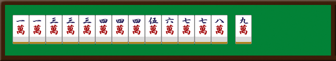 清一色(チンイツ) 清一色(チンイツ)とは? アタマもメンツも、すべてを1種類の数牌だけでそろえるアガリ役です。 同じ種類の数牌であれば、メンツの組み合わせは順子(※1)でも 刻子(※2)槓子(※3)でもOKです。 ポン、チー、カン(ミンカン)してもOKですが、その場合1翻下がります。 待ちの形は何でもOK。(下記参照) ※1 順子:数字が連続している3枚の同一種類の数牌。※2 刻子:同じ牌が3枚の組み合わせ。※3 槓子:同じ牌が4枚の組み合わせ。 ココがポイント! 特にメンゼン(※1)の場合、同じ種類の牌が多いために、テンパイ(※2)していても待ちがわかりづらいものです。そのわかりづらさに負けて、ついポンやチーなどをしてしまうことも。しかし、ポンやチーをすると1翻安くなるうえ、ほかの人に手がバレやすくもなります。 ※1 メンゼン:ほかの人が捨てた牌をもらわずに、自分のツモだけでアガリに向かっていくこと。※2 テンパイ:あと1牌くればアガリになる状態。 麻雀役 メニュー 1翻役 翻牌(ファンパイ) 立直(リーチ) 門前清自獏和(メンゼンツモ) 平和(ピンフ) 断ヤオ九(タンヤオ) 海底摸月(ハイテイツモ) 河底撈魚(ホウテイロン) 嶺上開花(リンシャンカイホー) 搶槓(チャンカン) 一盃口(イーペイコー) 2翻役 対々和(トイトイホー) 混老頭(ホンロウトウ) 三暗刻(サンアンコー) 三色同刻(サンショクドウコー) 三色同順(サンショクドウジュン) 小三元(ショウサンゲン) 一気通貫(イッキツーカン) 三槓子(サンカンツ) ダブルリーチ 混全帯ヤオ九(チャンタ) 七対子(チートイツ) 3翻役 混一色(ホンイツ) 純全帯ヤオ九(ジュンチャン) 二盃口(リャンペーコー) 6翻役 清一色(チンイツ) 役満 天和(テンホー) 地和(チーホー) 大三元(ダイサンゲン) 四喜和(スーシーホー) 字一色(ツーイーソー) 緑一色(リューイーソー) 清老頭(チンロウトウ) 四暗刻(スーアンコー) 国士無双(コクシムソウ) 九蓮宝燈(チューレンポートウ) 四槓子(スーカンツ)